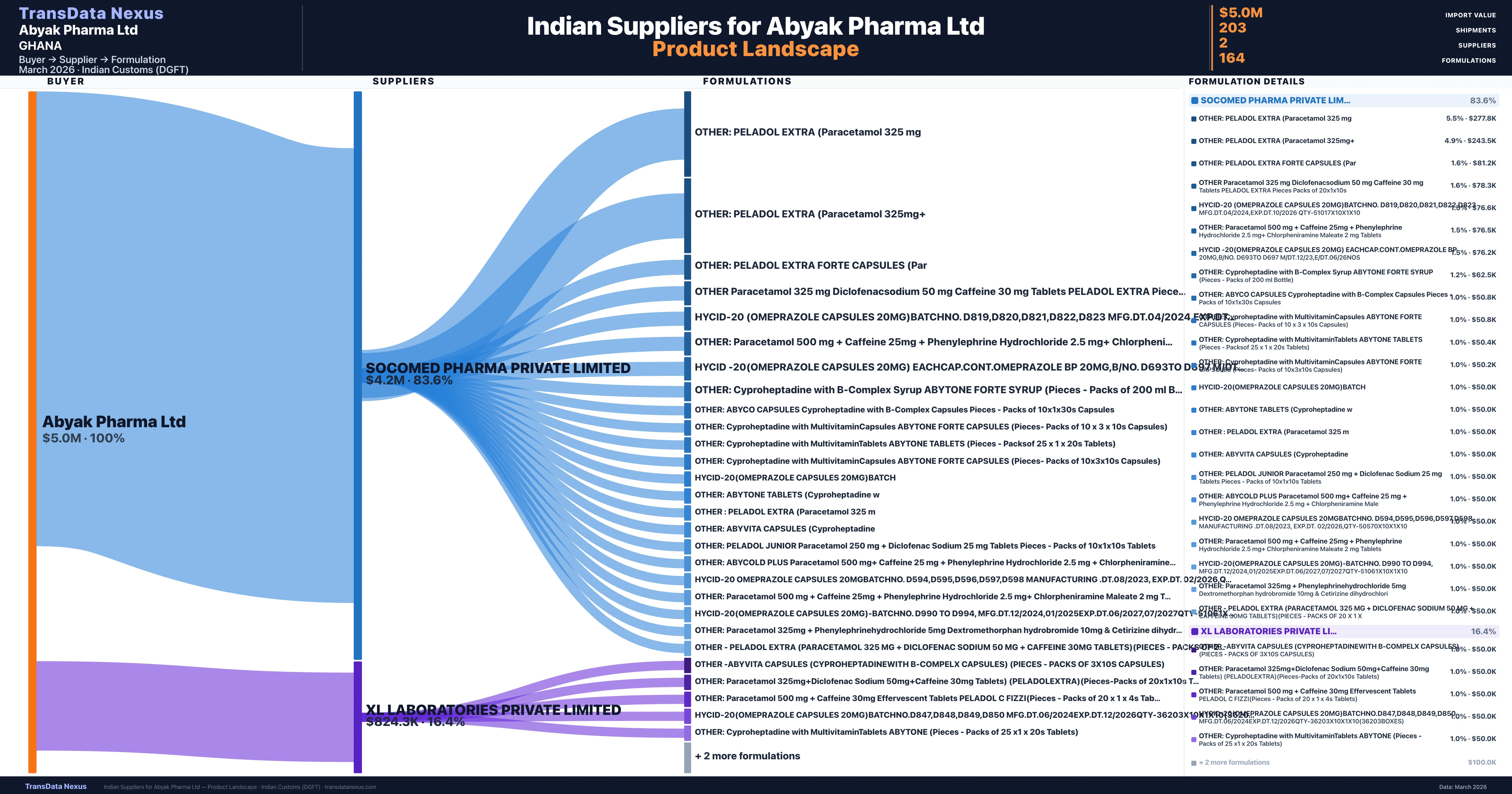 - 5.Supplier Verification: Abyak Pharma Ltd sources from 2 verified Indian suppliers across 164 formulations, confirmed from customs records.