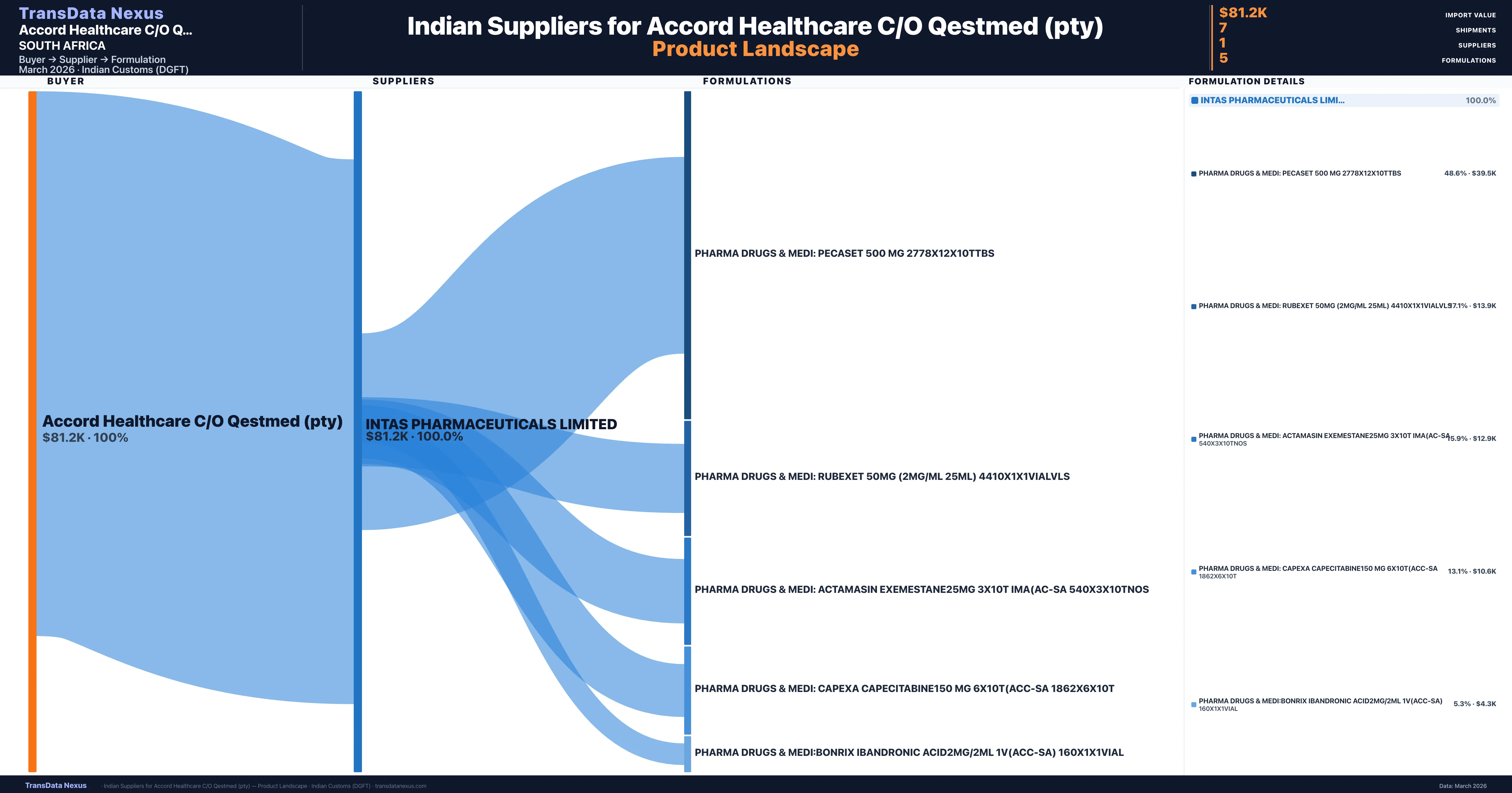 Accord Healthcare C/O Qestmed (pty) sources from 1 verified Indian supplier across 5 distinct formulations. The sourcing is highly concentrated β Intas Pharmaceuticals Limited accounts for 100.0% of total imports, indicating a strategic single-source relationship.