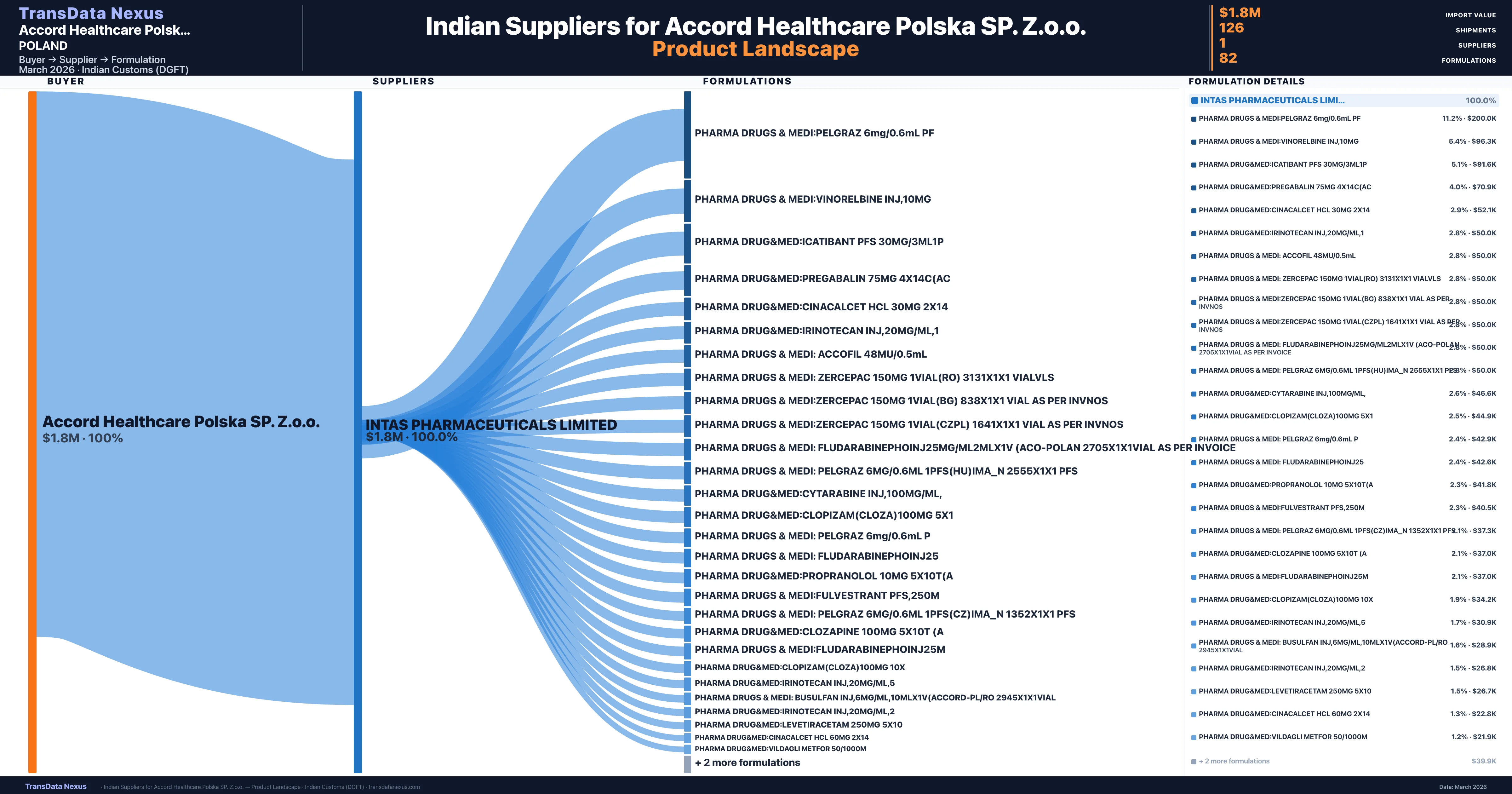 Accord Healthcare Polska SP. Z.o.o. sources from 1 verified Indian supplier across 82 distinct formulations. The sourcing is highly concentrated β Intas Pharmaceuticals Limited accounts for 100.0% of total imports, indicating a strategic single-source relationship.