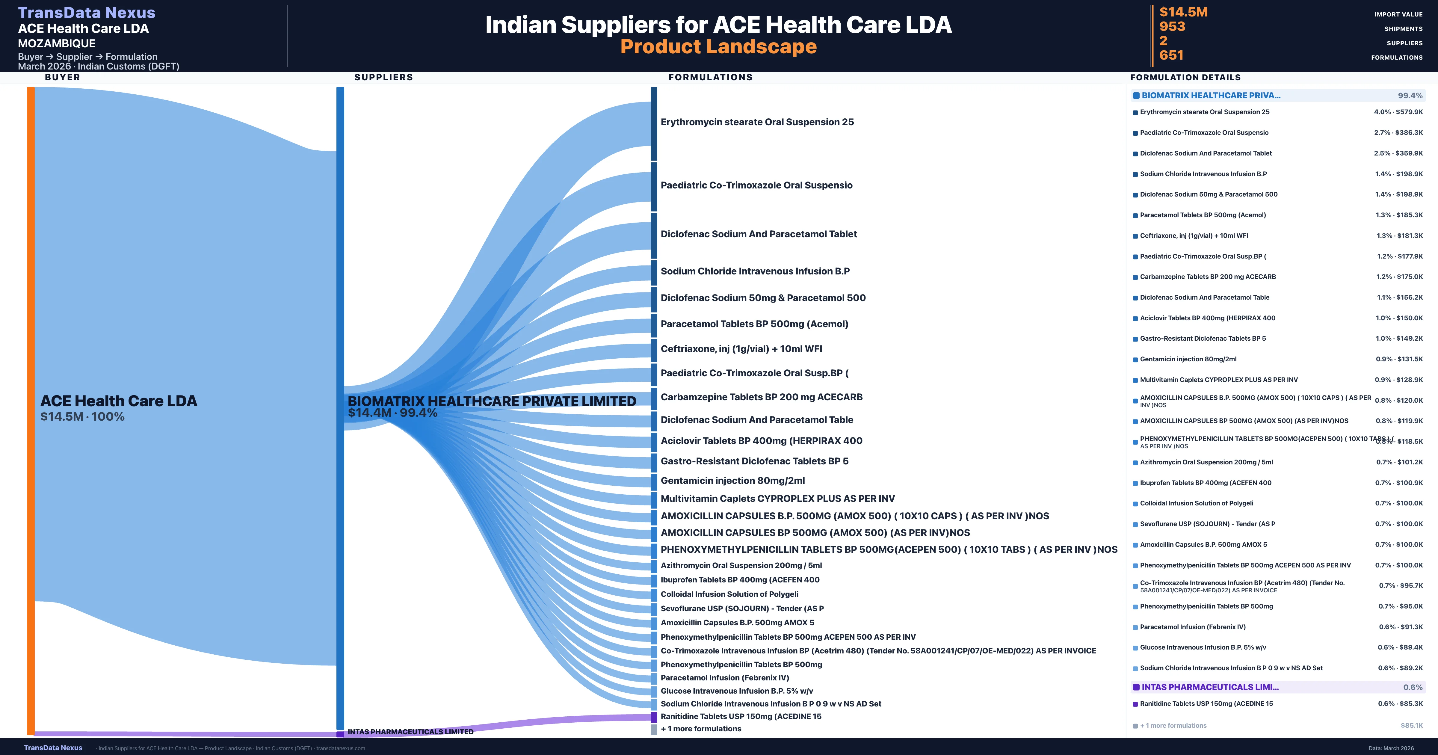 ACE Health Care LDA is a pharmaceutical importer based in Mozambique with a total trade value of $1.4M across 3 products in 3 therapeutic categories. Based on 51 verified import shipments from Indian Customs (DGFT) records, the company actively imports across multiple product segments. ACE Health Care LDA sources from 2 verified Indian suppliers, with Biomatrix Healthcare Private Limited accounting for 99.4% of imports.