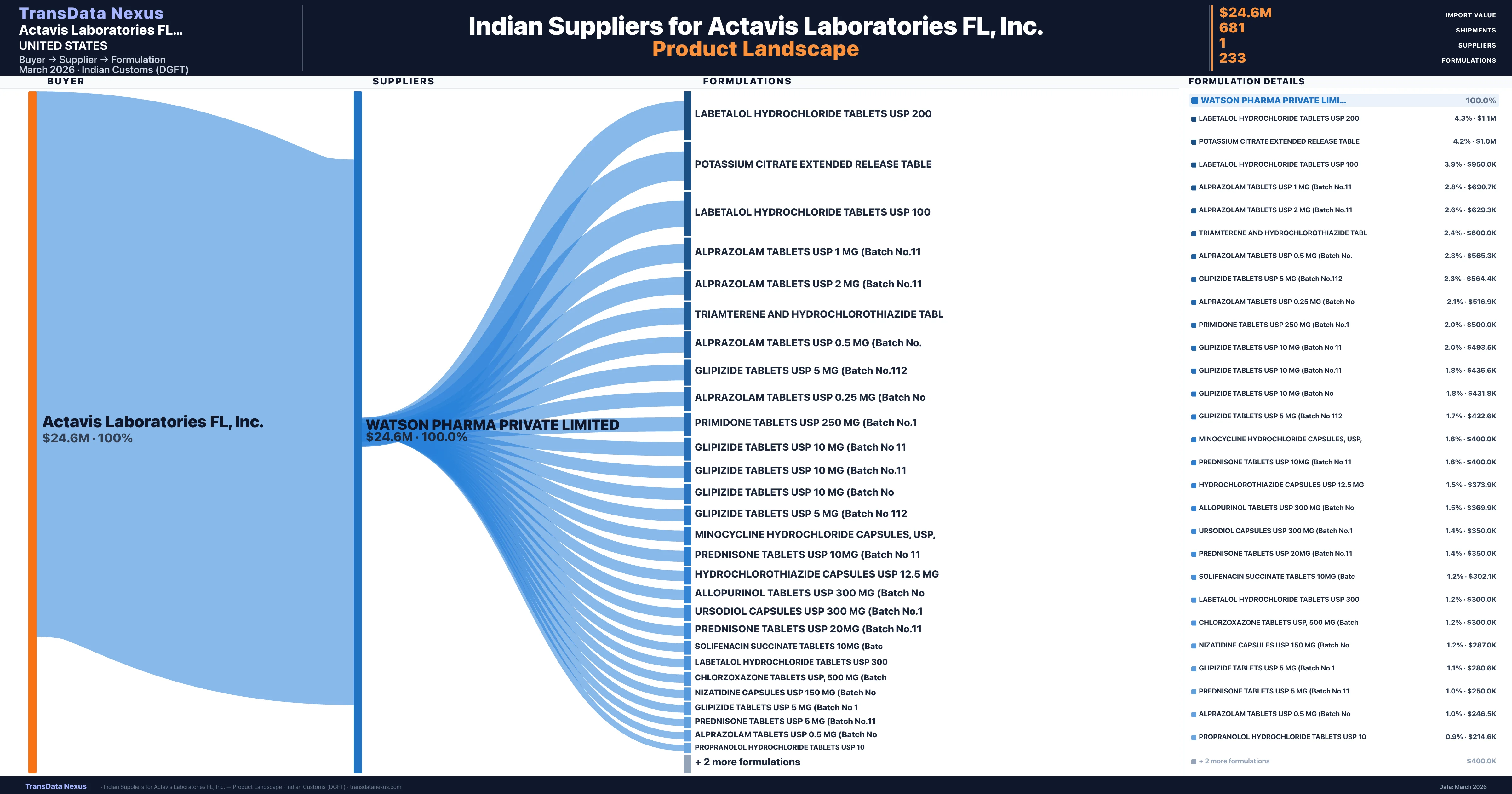 Actavis Laboratories FL, Inc. imports 233 distinct pharmaceutical formulations. Showing top 15 by value. For full formulation-level data, contact TransData Nexus.