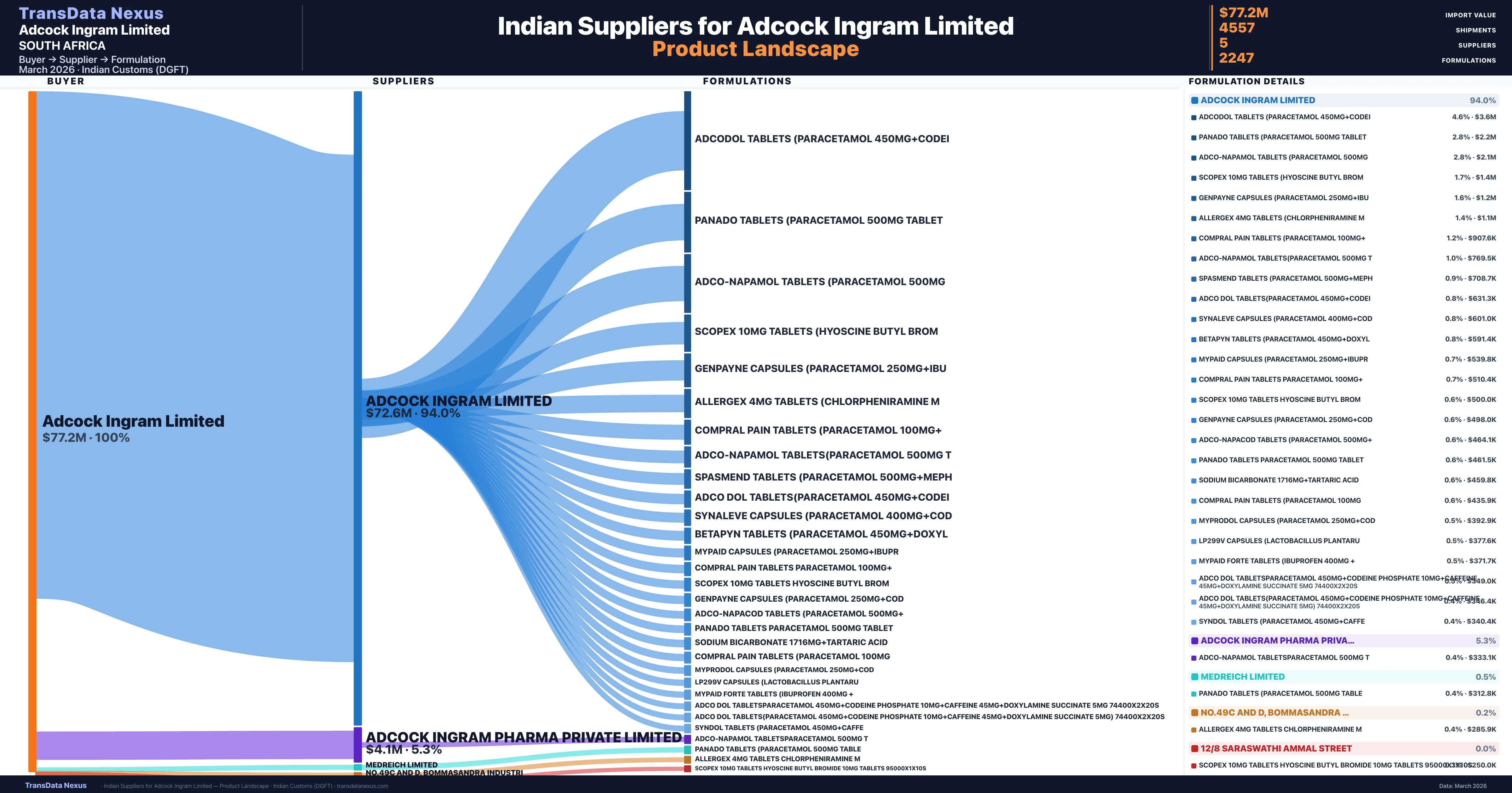 Adcock Ingram Limited sources from 5 verified Indian suppliers across 2,247 distinct formulations. The sourcing is highly concentrated — Adcock Ingram Limited accounts for 94.0% of total imports, indicating a strategic single-source relationship.
