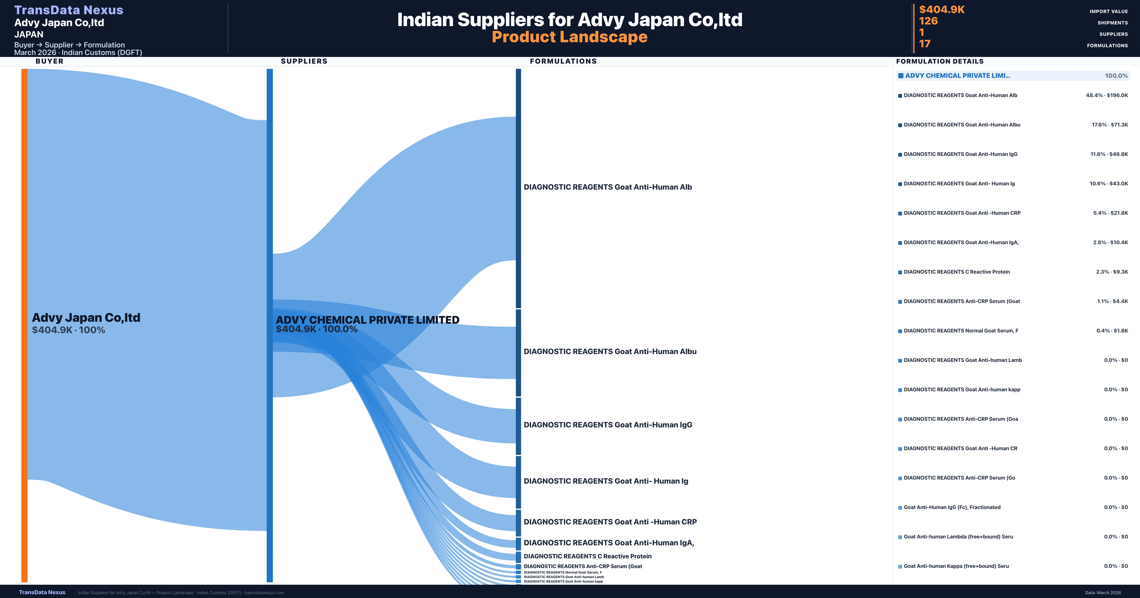 Advy Japan Co,ltd sources from 1 verified Indian supplier across 17 distinct formulations. The sourcing is highly concentrated — Advy Chemical Private Limited accounts for 100.0% of total imports, indicating a strategic single-source relationship.