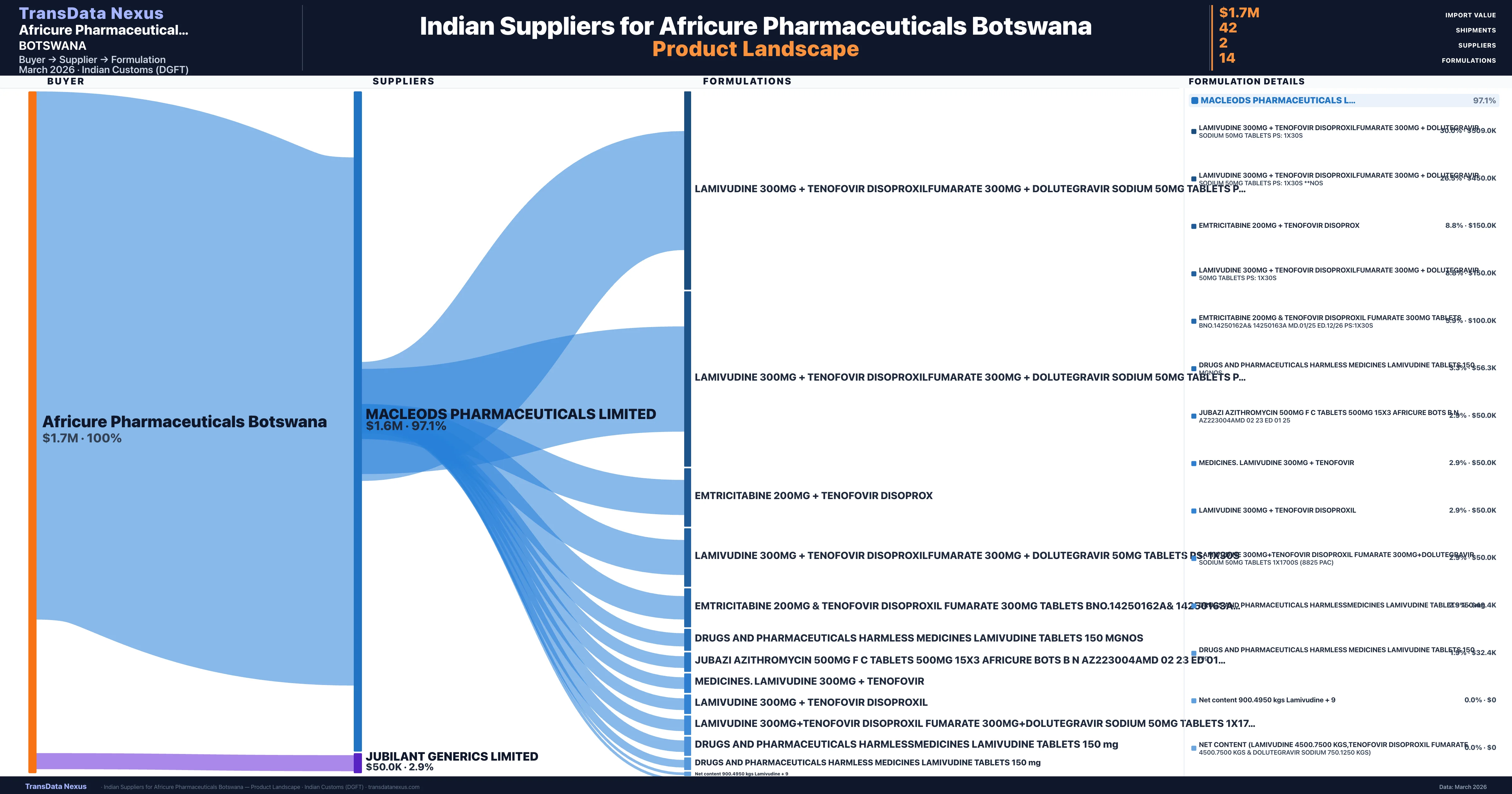 Africure Pharmaceuticals Botswana sources from 2 verified Indian suppliers across 14 distinct formulations. The sourcing is highly concentrated — Macleods Pharmaceuticals Limited accounts for 97.1% of total imports, indicating a strategic single-source relationship.