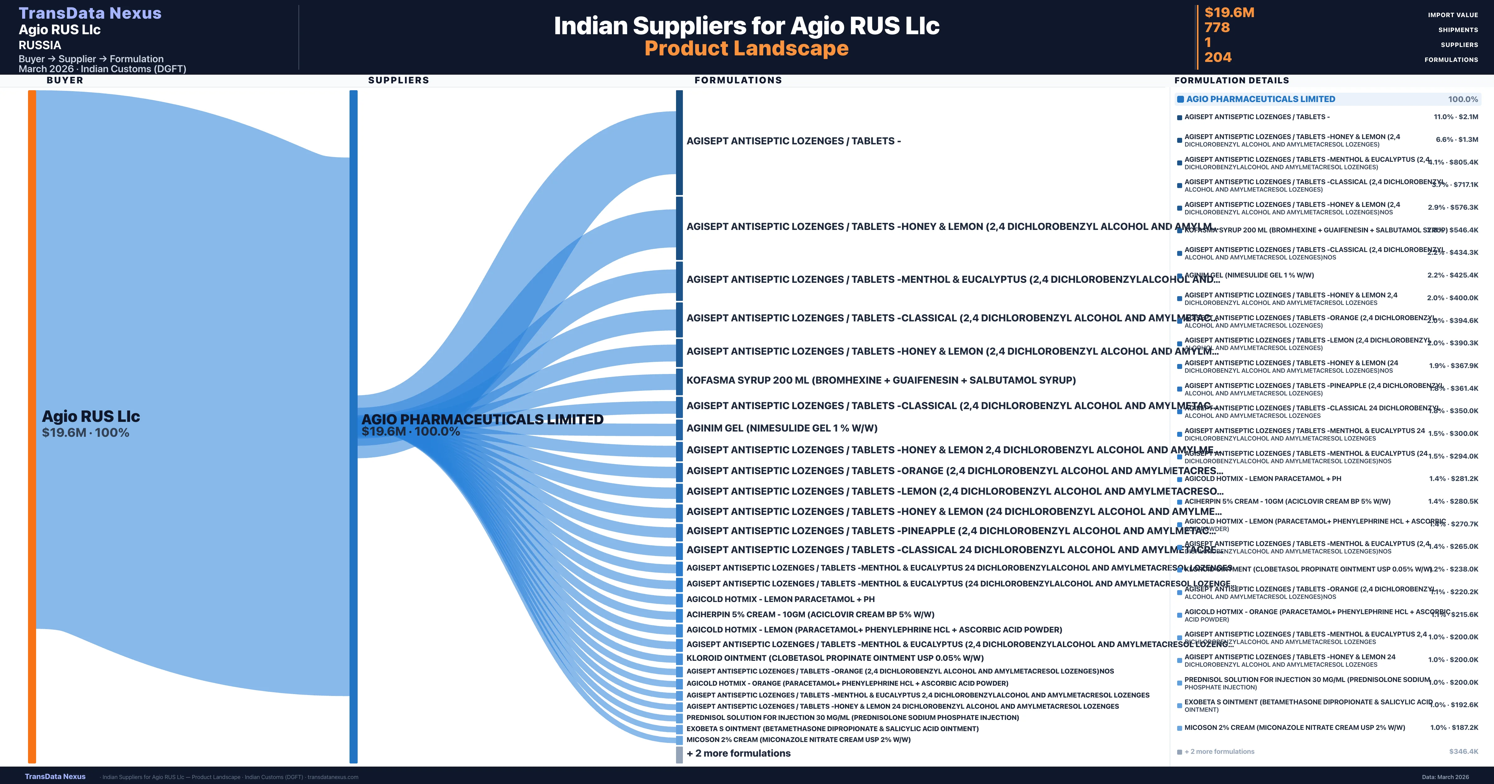 - 5.Supplier Verification: Agio RUS Llc sources from 1 verified Indian suppliers across 204 formulations, confirmed from customs records.