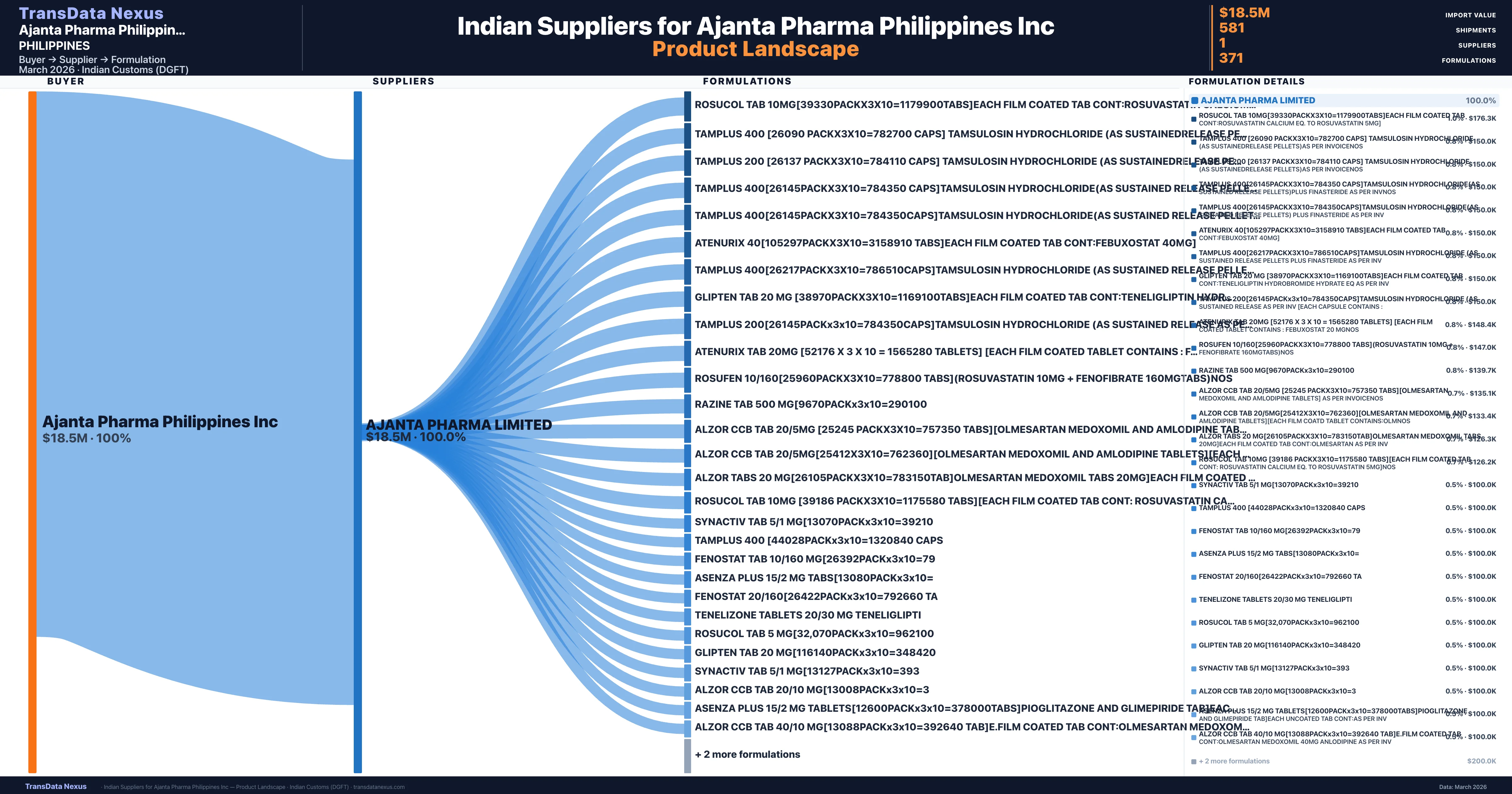 Ajanta Pharma Philippines Inc imports 371 distinct pharmaceutical formulations. Showing top 15 by value. For full formulation-level data, contact TransData Nexus.
