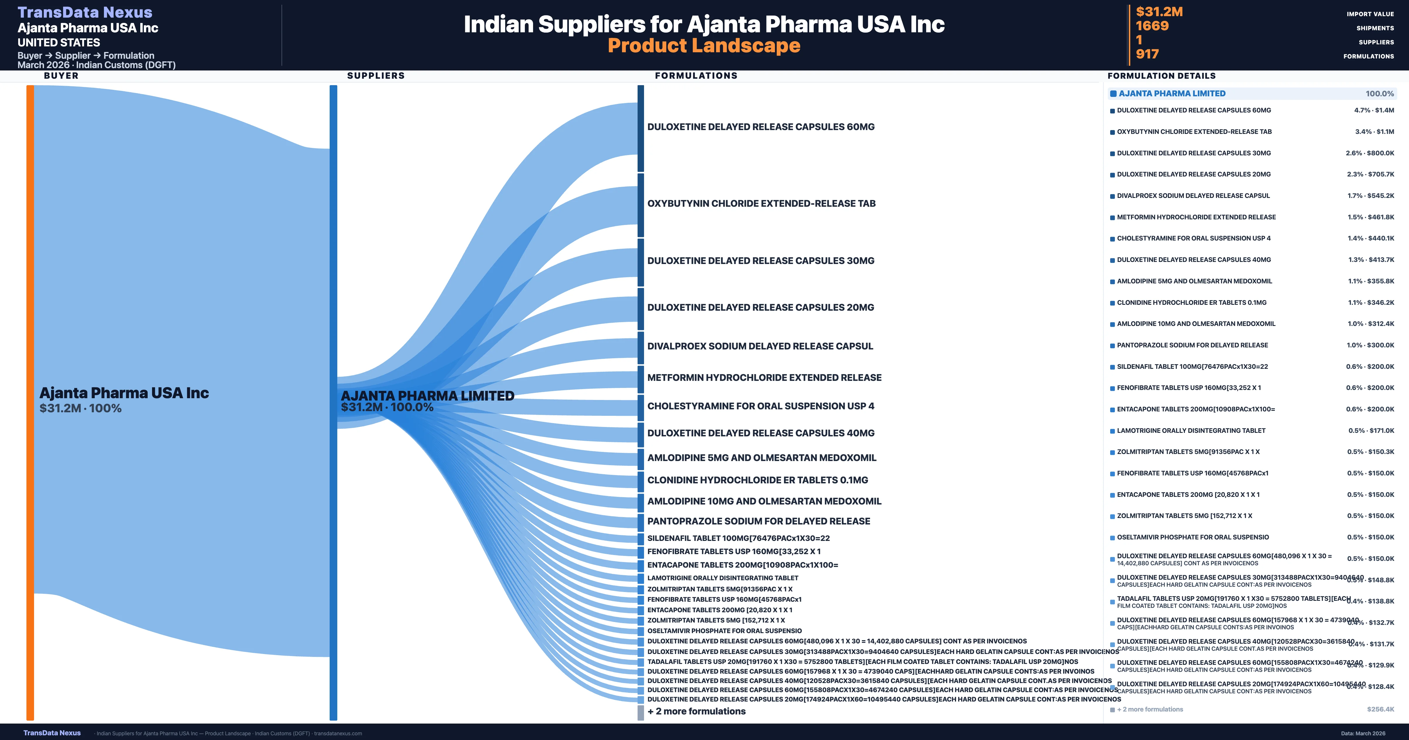 Ajanta Pharma USA Inc sources from 1 verified Indian supplier across 917 distinct formulations. The sourcing is highly concentrated — Ajanta Pharma Limited accounts for 100.0% of total imports, indicating a strategic single-source relationship.