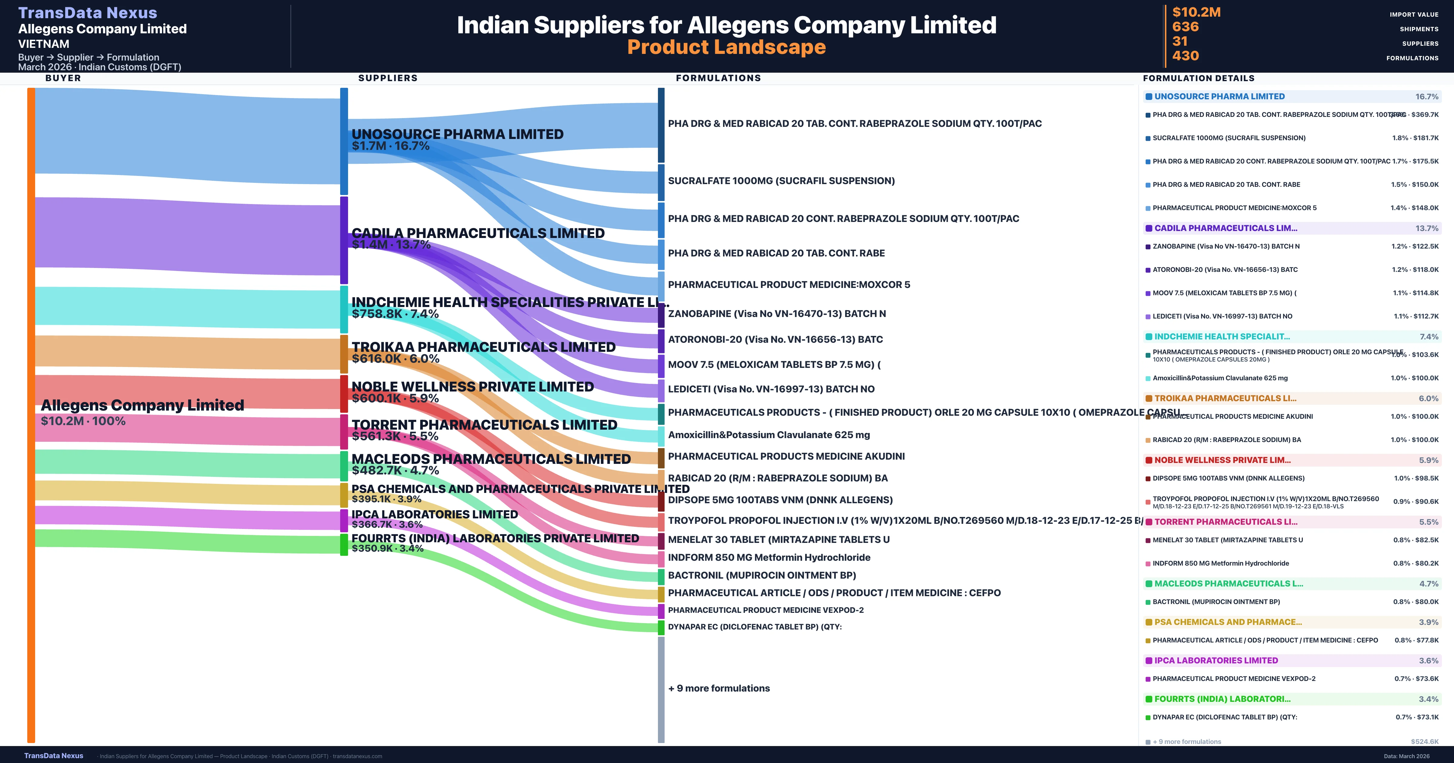 Allegens Company Limited is a pharmaceutical importer based in Vietnam with a total trade value of $800.0K across 2 products in 2 therapeutic categories. Based on 16 verified import shipments from Indian Customs (DGFT) records, the company actively imports across multiple product segments. Allegens Company Limited sources from 31 verified Indian suppliers, with Unosource Pharma Limited accounting for 16.7% of imports.