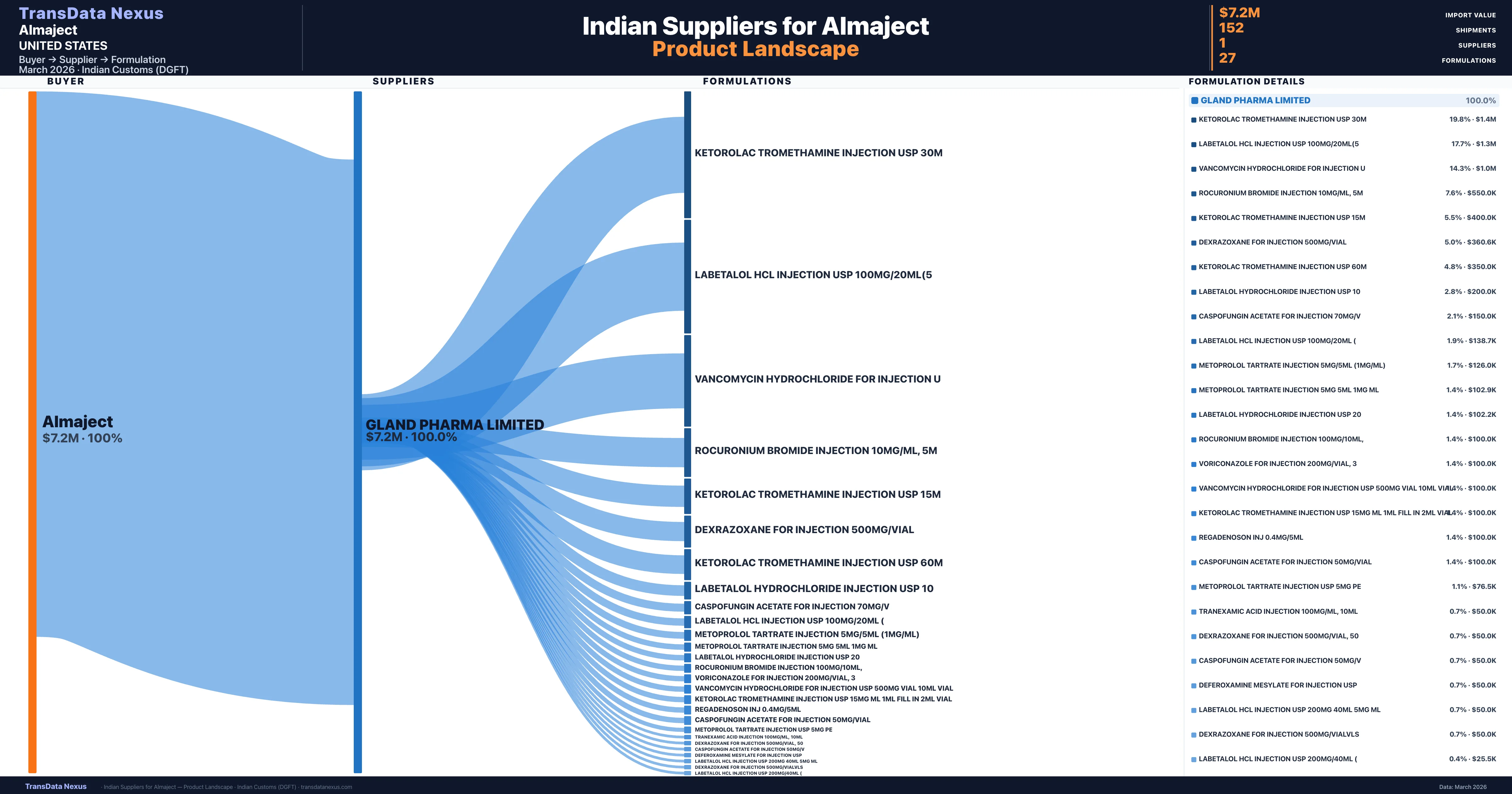 Almaject's sourcing strategy exhibits a high degree of concentration, with a significant reliance on a single supplier for its injectable pharmaceutical products. According to TransData Nexus proprietary trade data, Almaject has imported a total of $1.3 million worth of finished pharmaceutical formulations from India over 26 shipments, with 100% of these imports originating from GLAND PHARMA LIMITED.