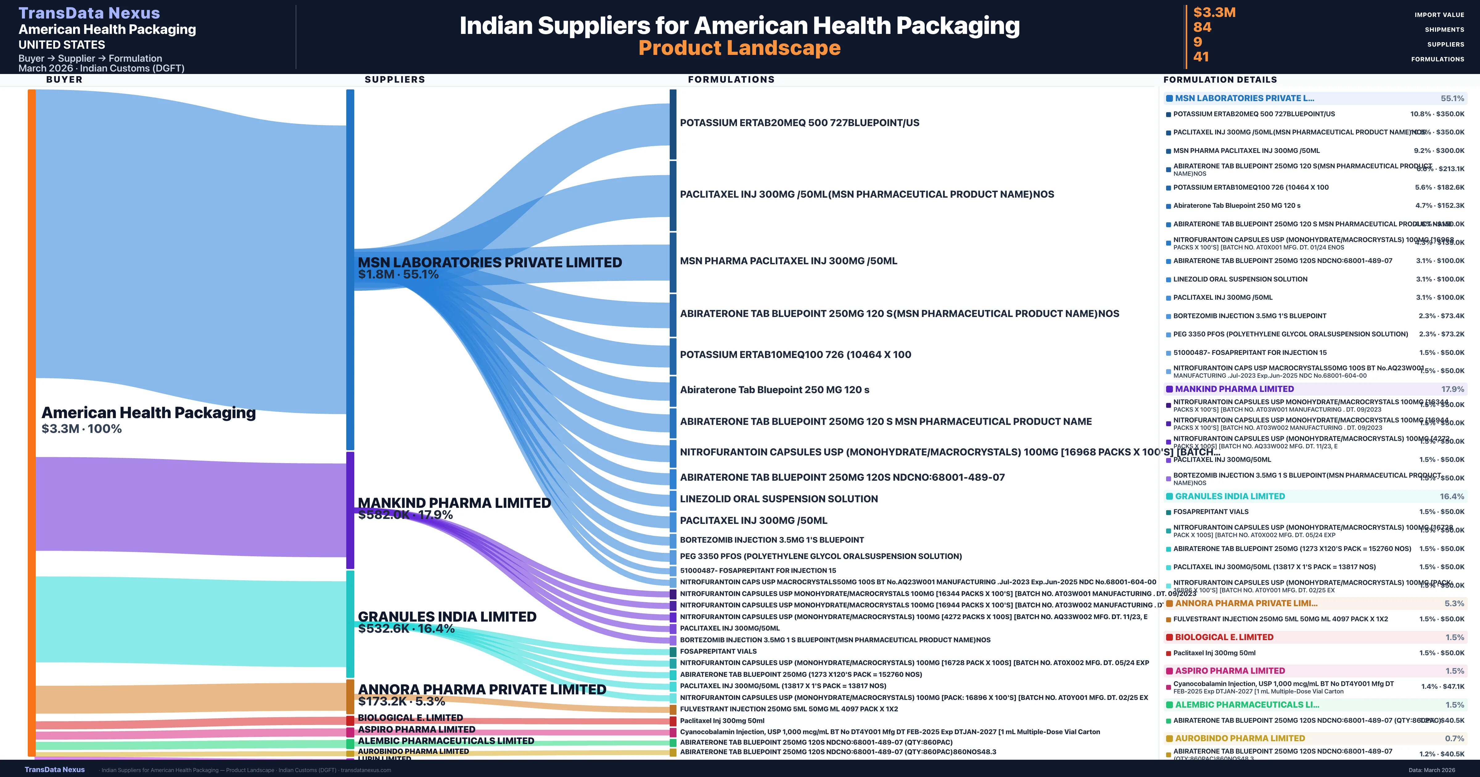 American Health Packaging sources from 9 verified Indian suppliers across 41 distinct formulations. The supply base is diversified across 9 suppliers, reducing single-source dependency risk.