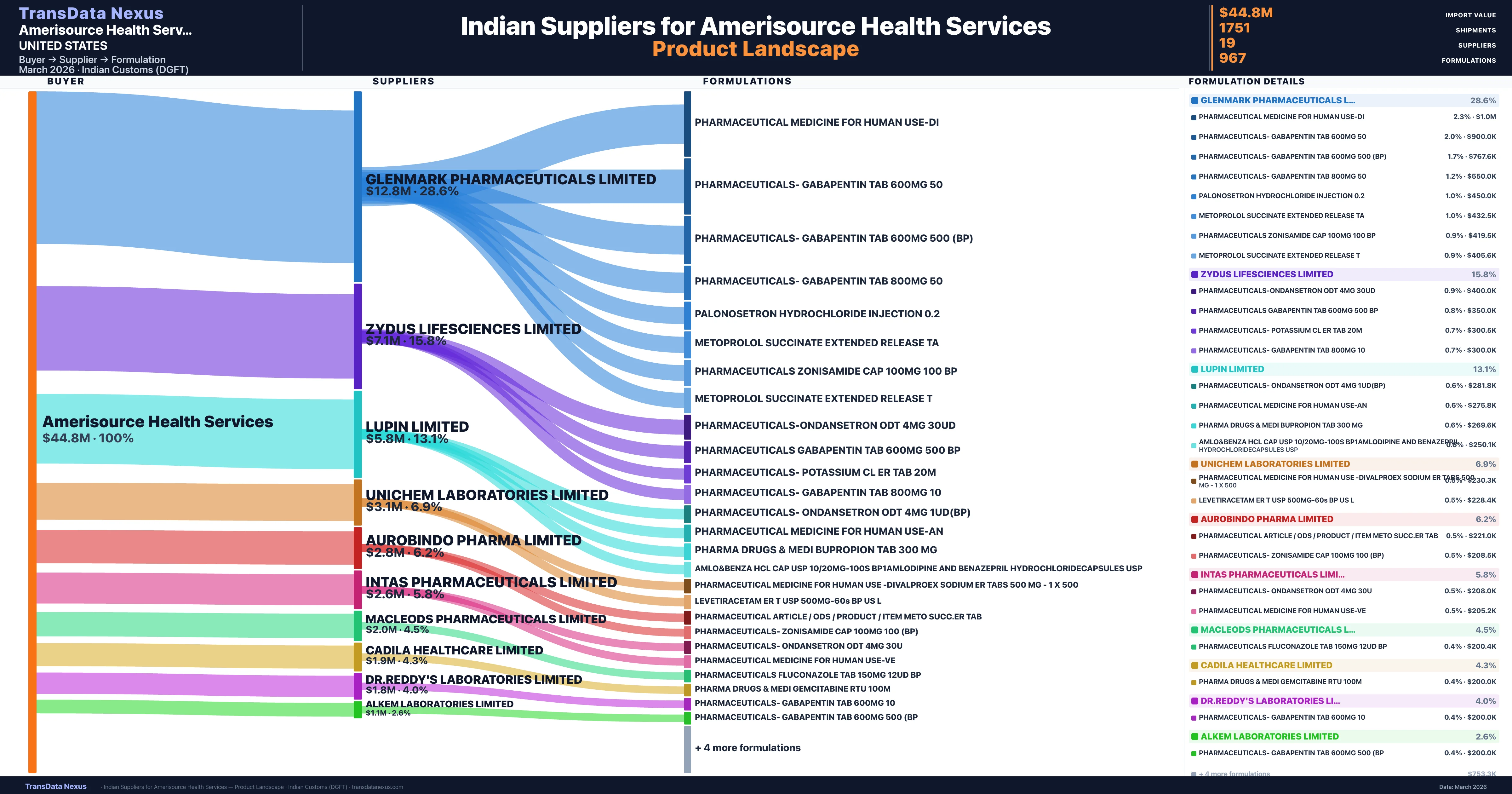 Amerisource Health Services sources from 19 verified Indian suppliers across 967 distinct formulations. The supply base is diversified across 19 suppliers, reducing single-source dependency risk.