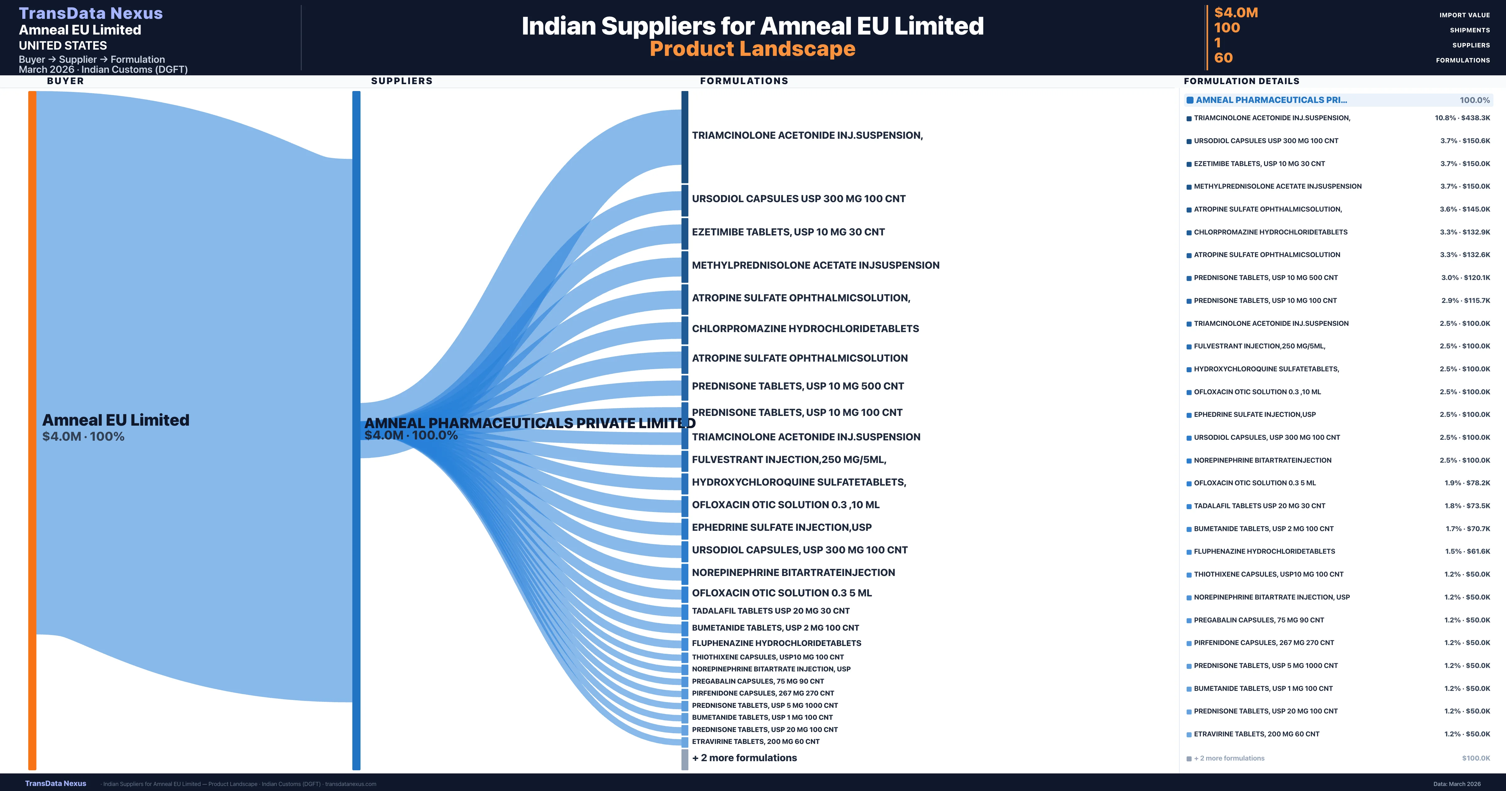 Amneal EU Limited sources from 1 verified Indian supplier across 60 distinct formulations. The sourcing is highly concentrated — Amneal Pharmaceuticals Private Limited accounts for 100.0% of total imports, indicating a strategic single-source relationship.