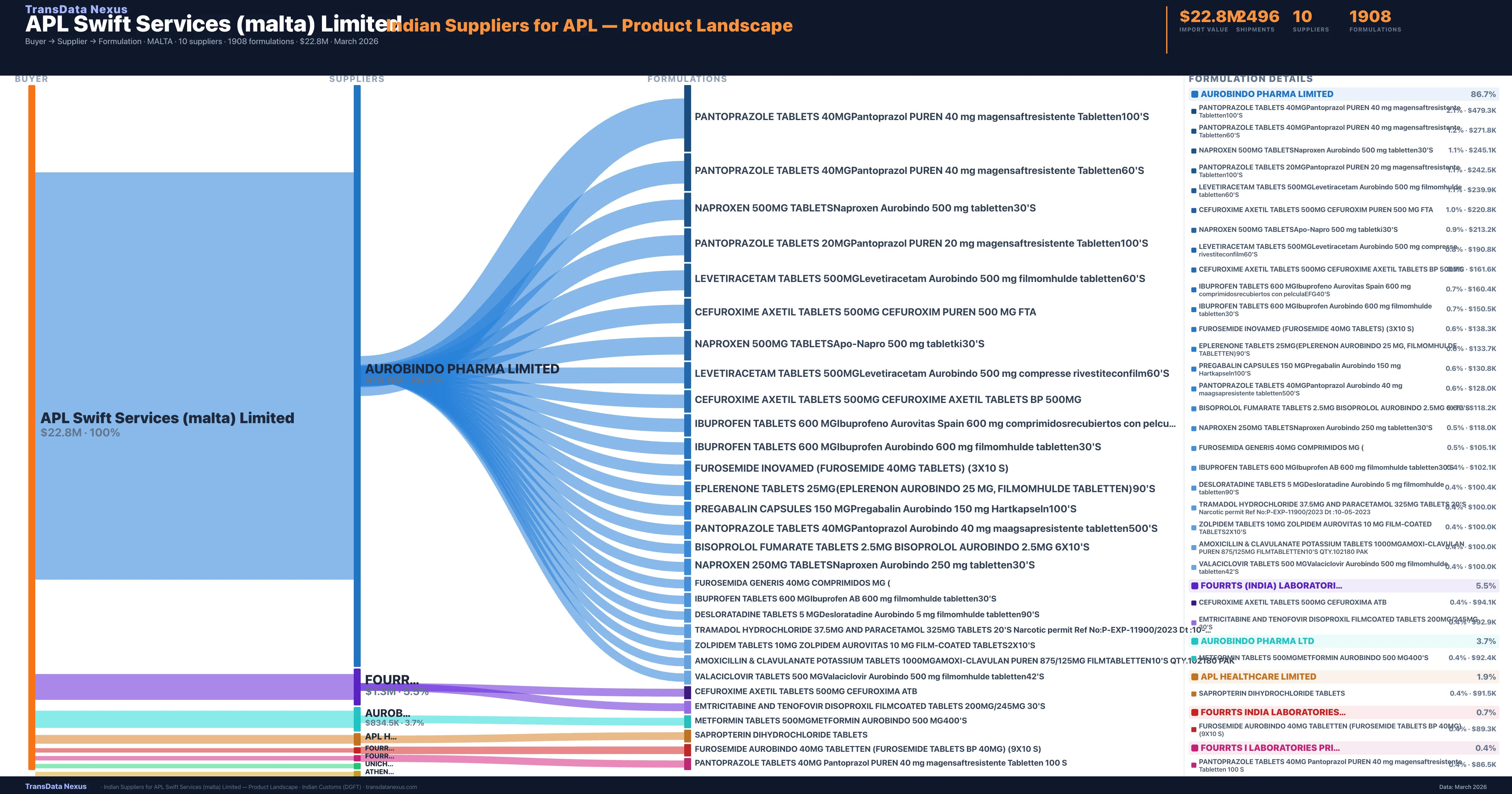 APL Swift Services (malta) Limited sources from 10 verified Indian suppliers. The primary supplier is Aurobindo Pharma Limited (86.7% of imports, $19.8M).