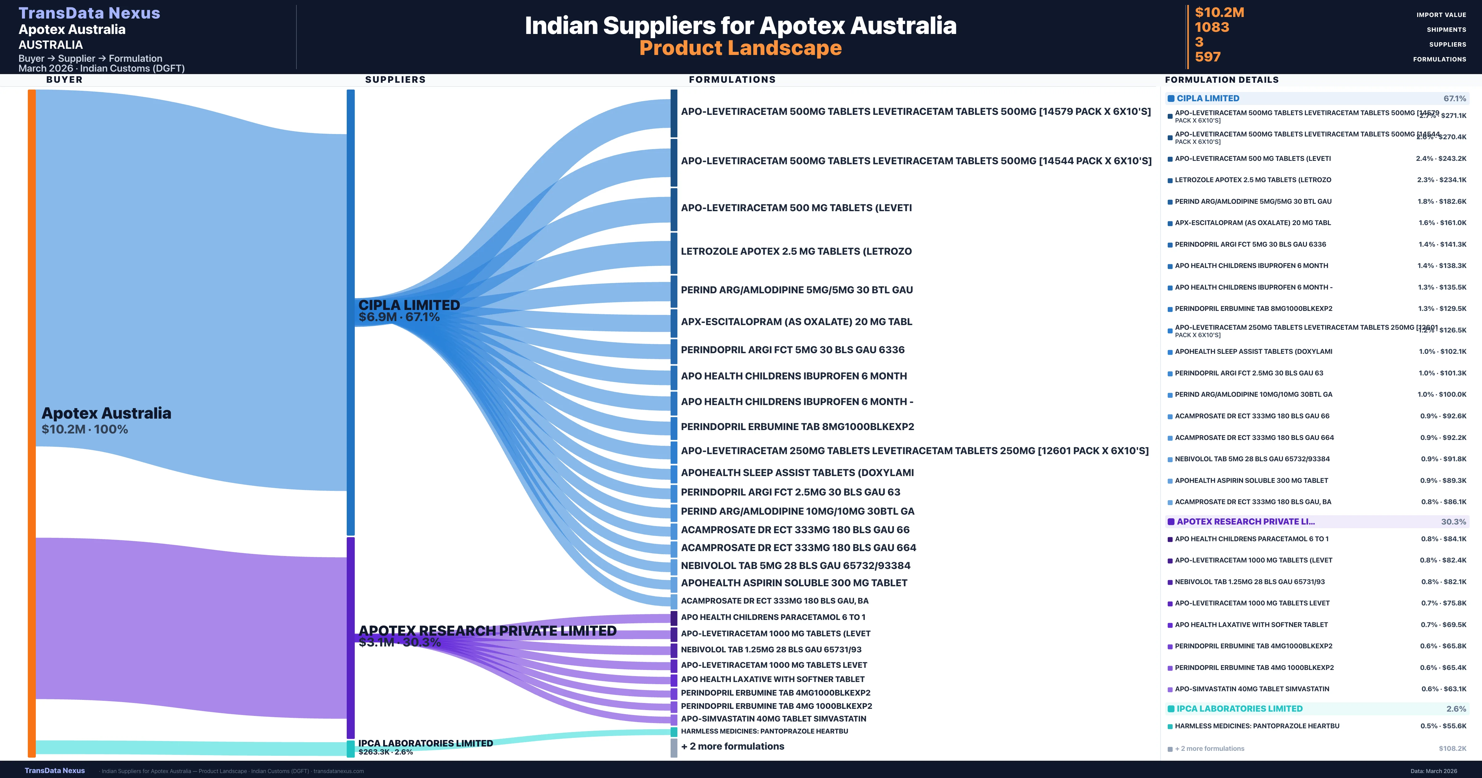 Apotex Australia is a pharmaceutical importer based in Australia with a total trade value of $1.5M across 3 products in 3 therapeutic categories. Based on 115 verified import shipments from Indian Customs (DGFT) records, the company actively imports across multiple product segments. Apotex Australia sources from 3 verified Indian suppliers, with Cipla Limited accounting for 67.1% of imports.