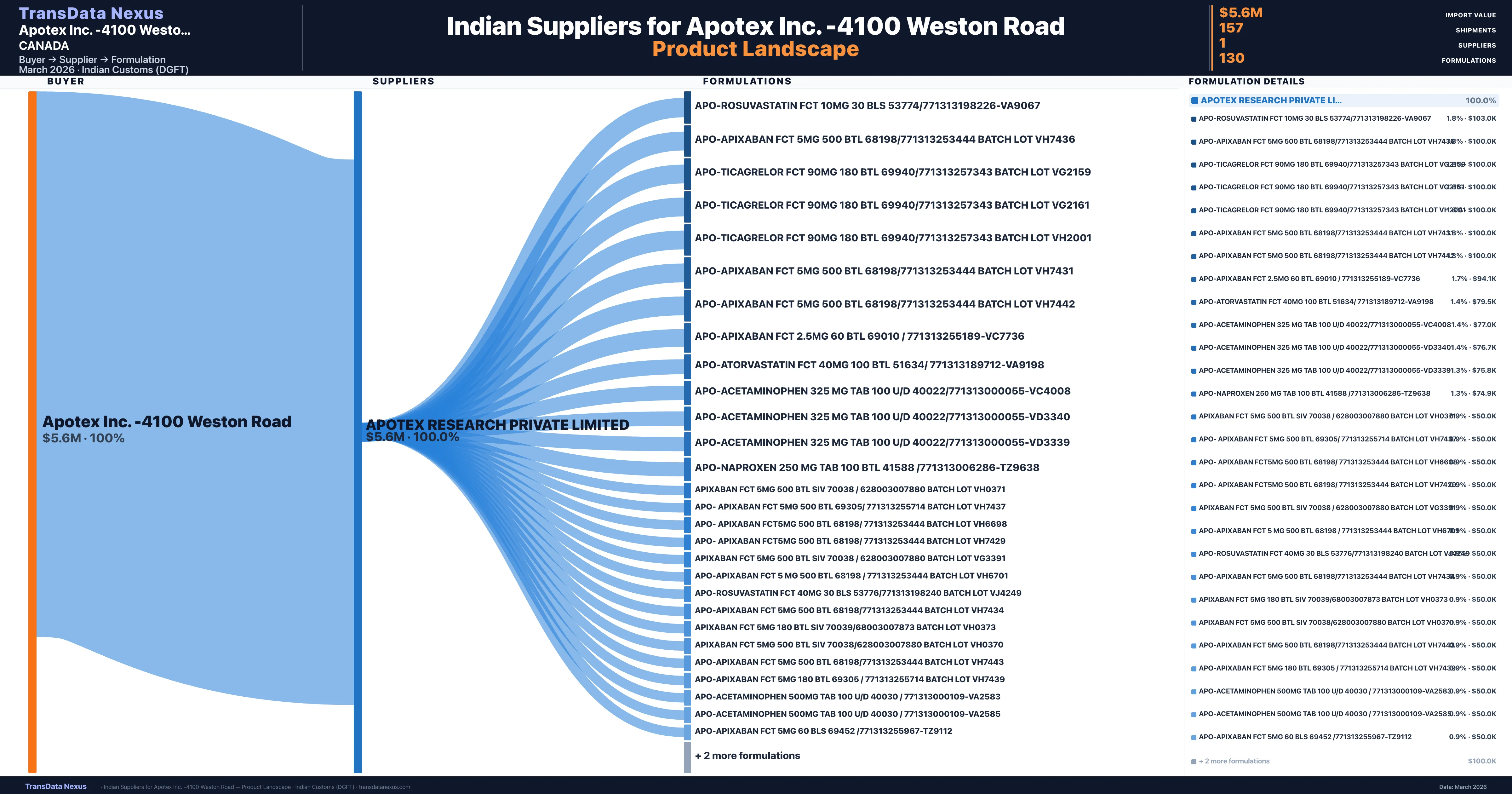 Apotex Inc. -4100 Weston Road sources from 1 verified Indian supplier across 130 distinct formulations. The sourcing is highly concentrated β Apotex Research Private Limited accounts for 100.0% of total imports, indicating a strategic single-source relationship.
