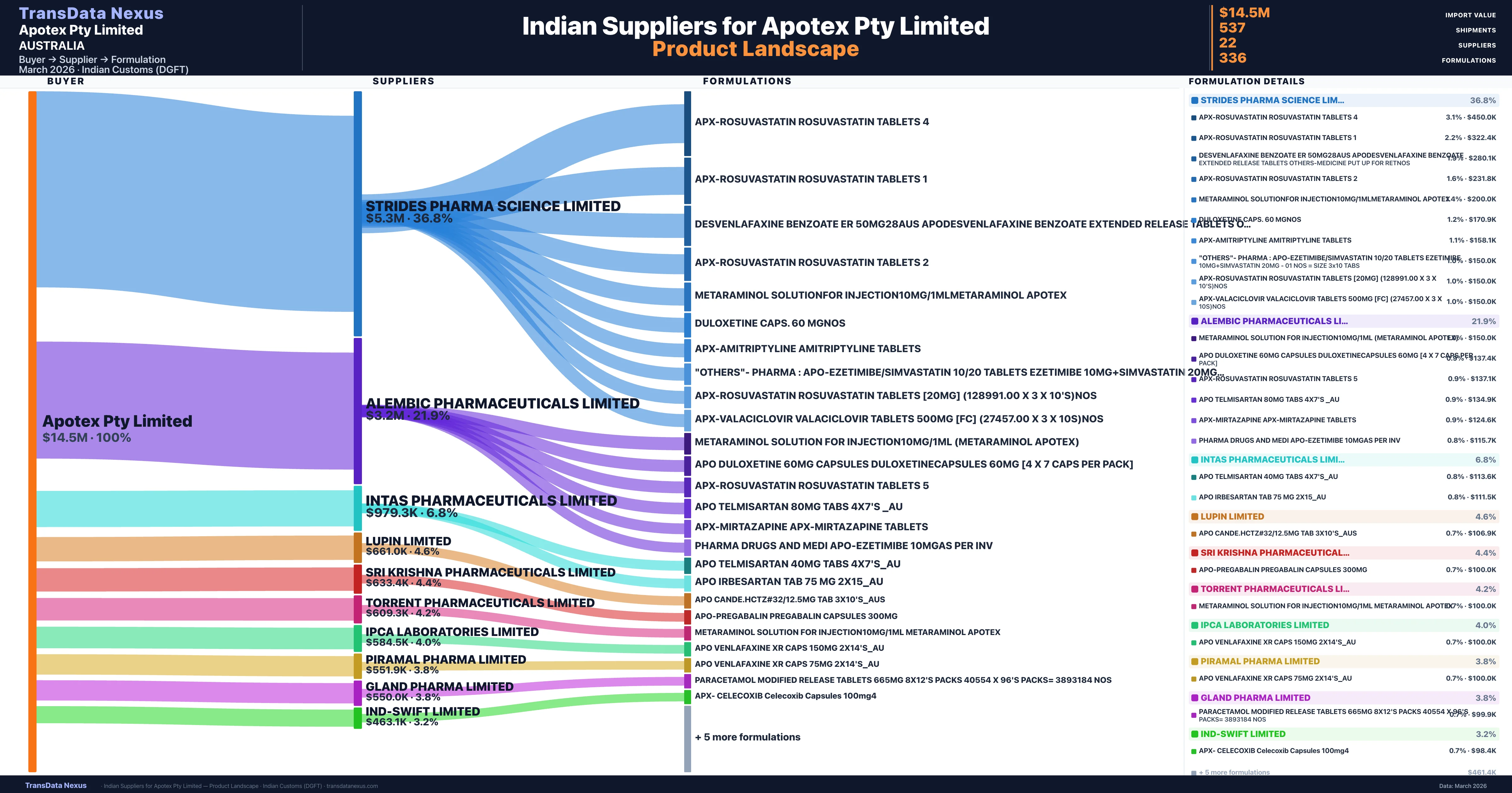 Apotex Pty Limited sources from 22 verified Indian suppliers. The primary supplier is Strides Pharma Science Limited (36.8% of imports, $5.3M).