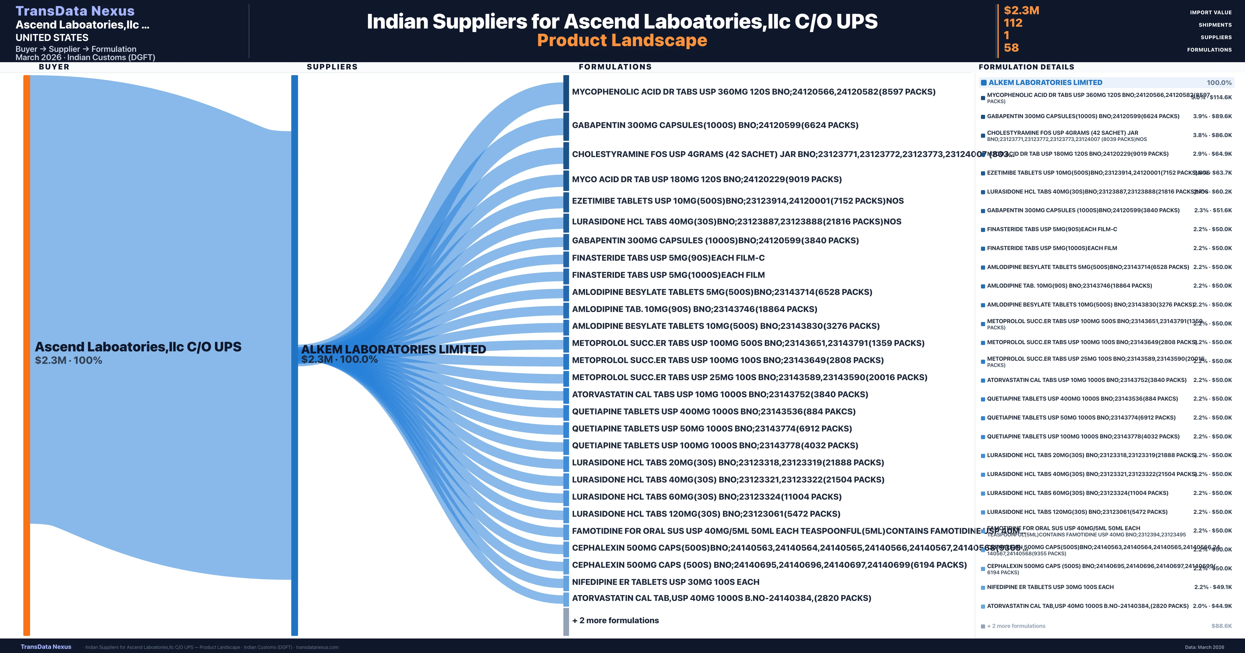 Ascend Laboatories,llc C/O UPS sources from 1 verified Indian supplier across 58 distinct formulations. The sourcing is highly concentrated β Alkem Laboratories Limited accounts for 100.0% of total imports, indicating a strategic single-source relationship.