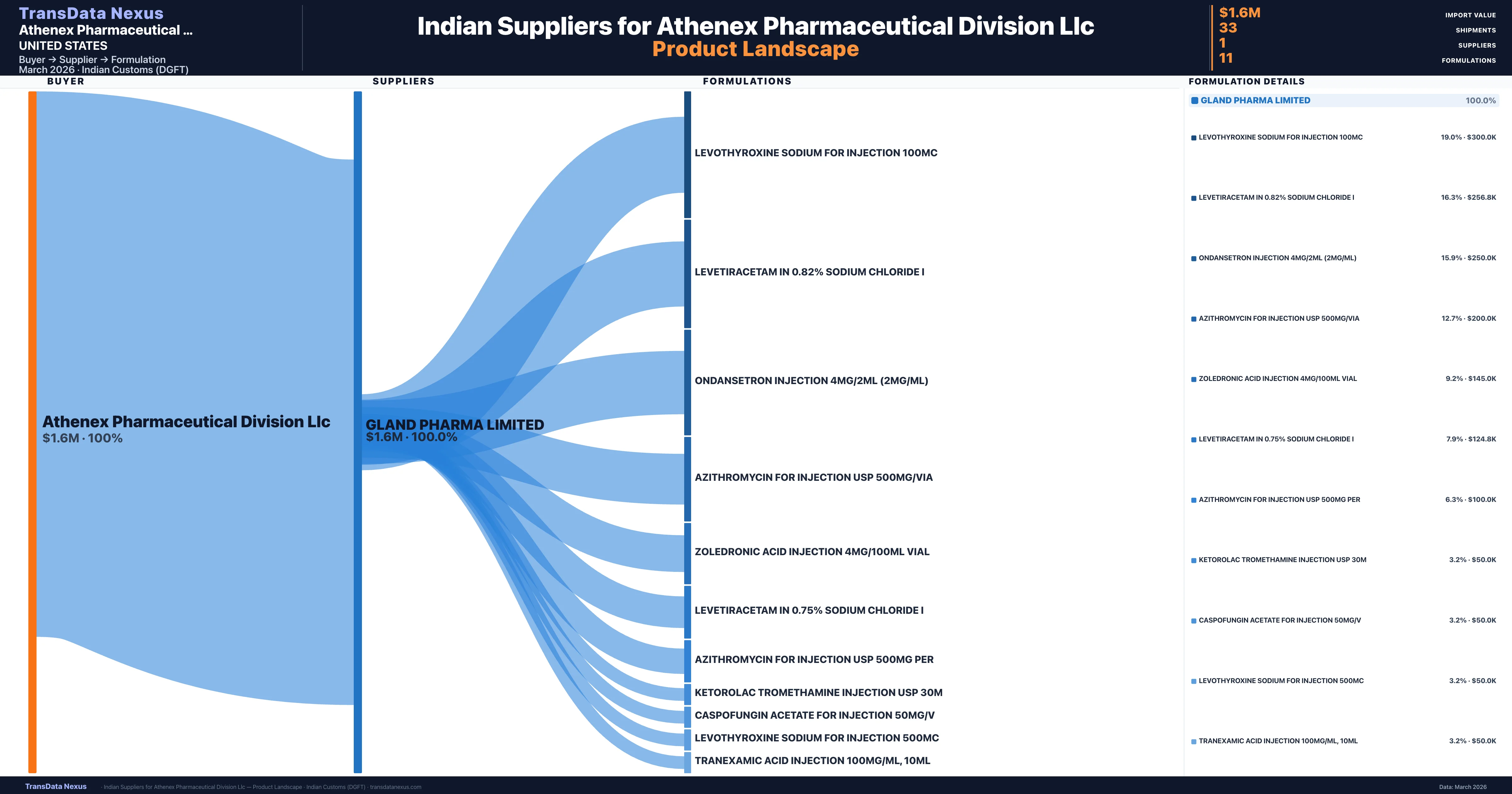 Athenex Pharmaceutical Division Llc sources from 1 verified Indian supplier across 11 distinct formulations. The sourcing is highly concentrated — Gland Pharma Limited accounts for 100.0% of total imports, indicating a strategic single-source relationship.