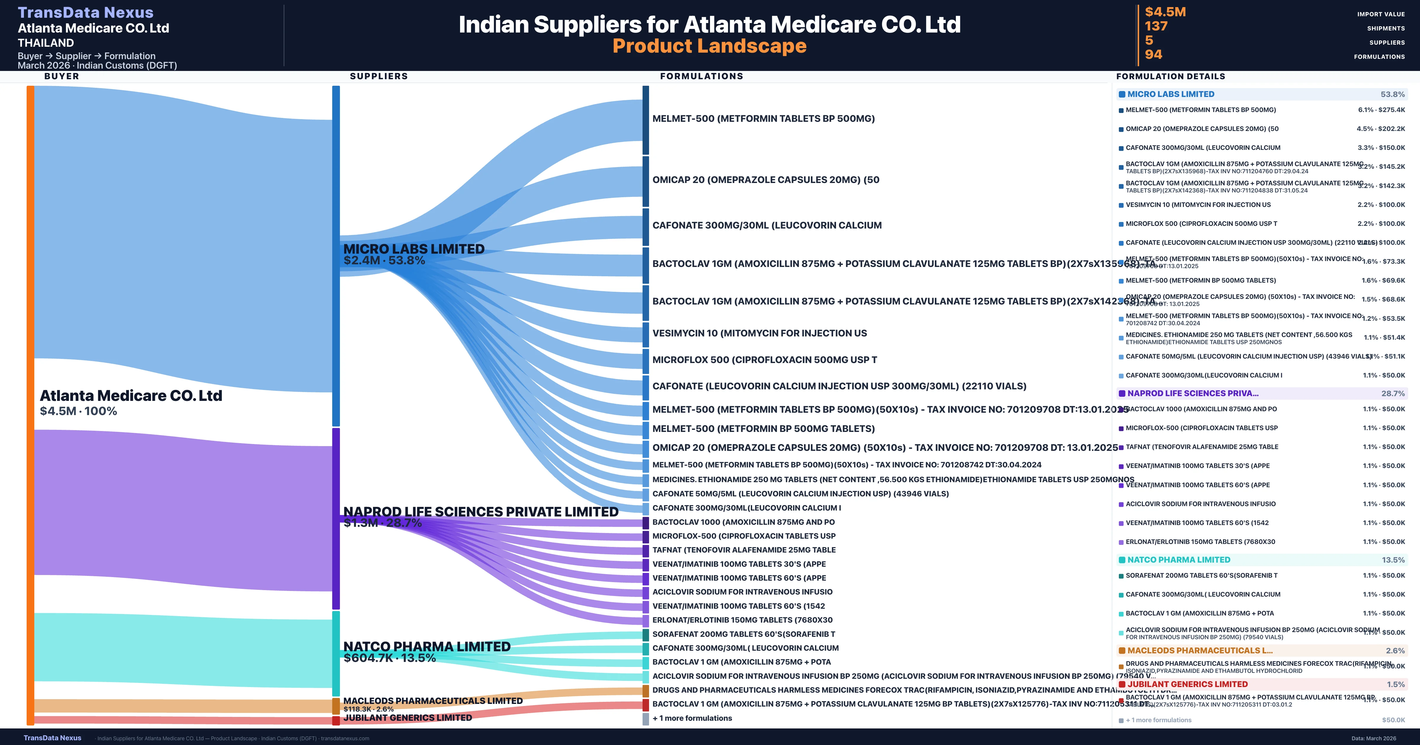 - 5.Supplier Verification: Atlanta Medicare CO. Ltd sources from 5 verified Indian suppliers across 94 formulations, confirmed from customs records.