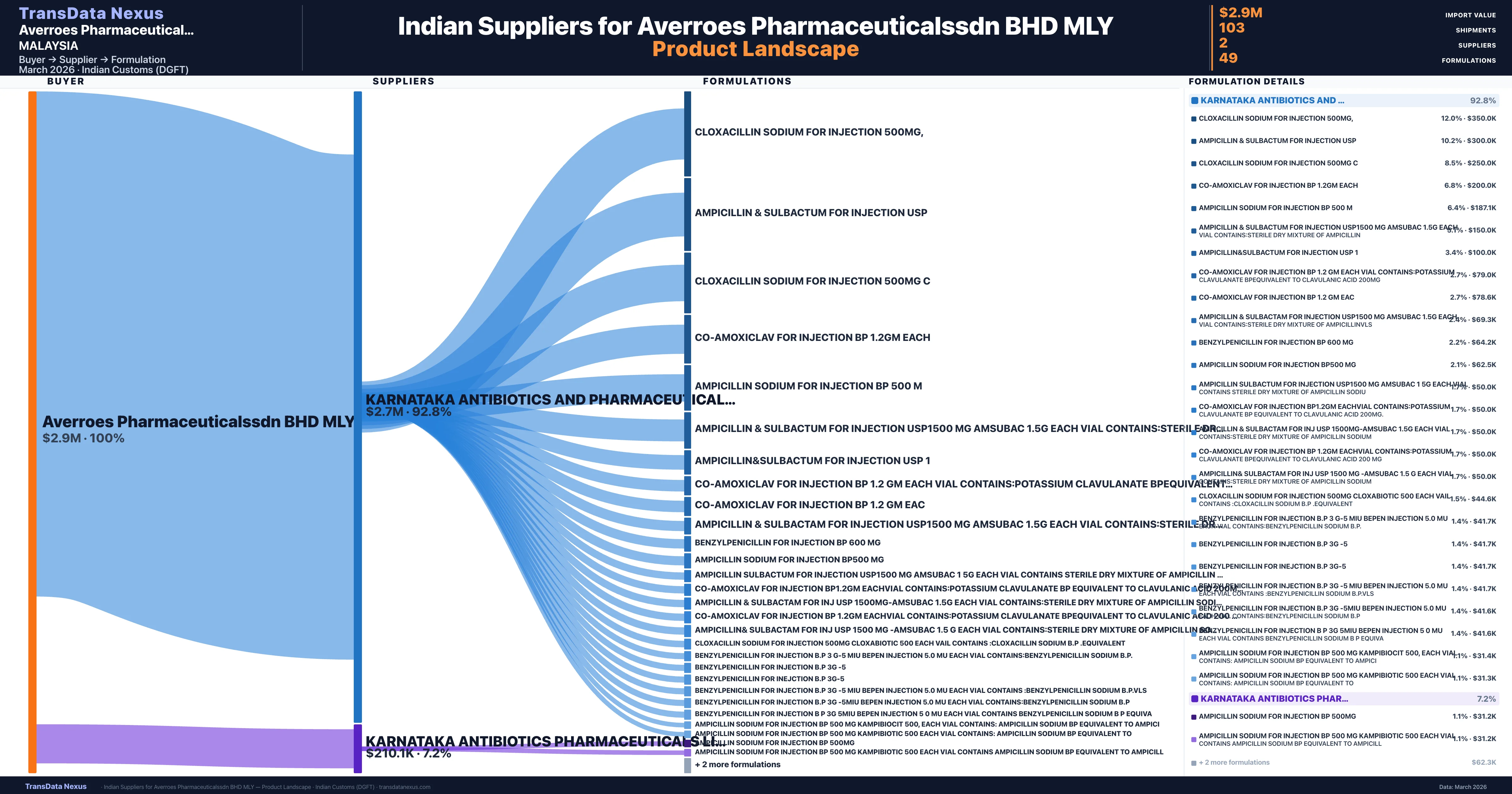 Averroes Pharmaceuticalssdn BHD MLY sources from 2 verified Indian suppliers. The primary supplier is Karnataka Antibiotics And Pharmaceuticals Limited (92.8% of imports, $2.7M).