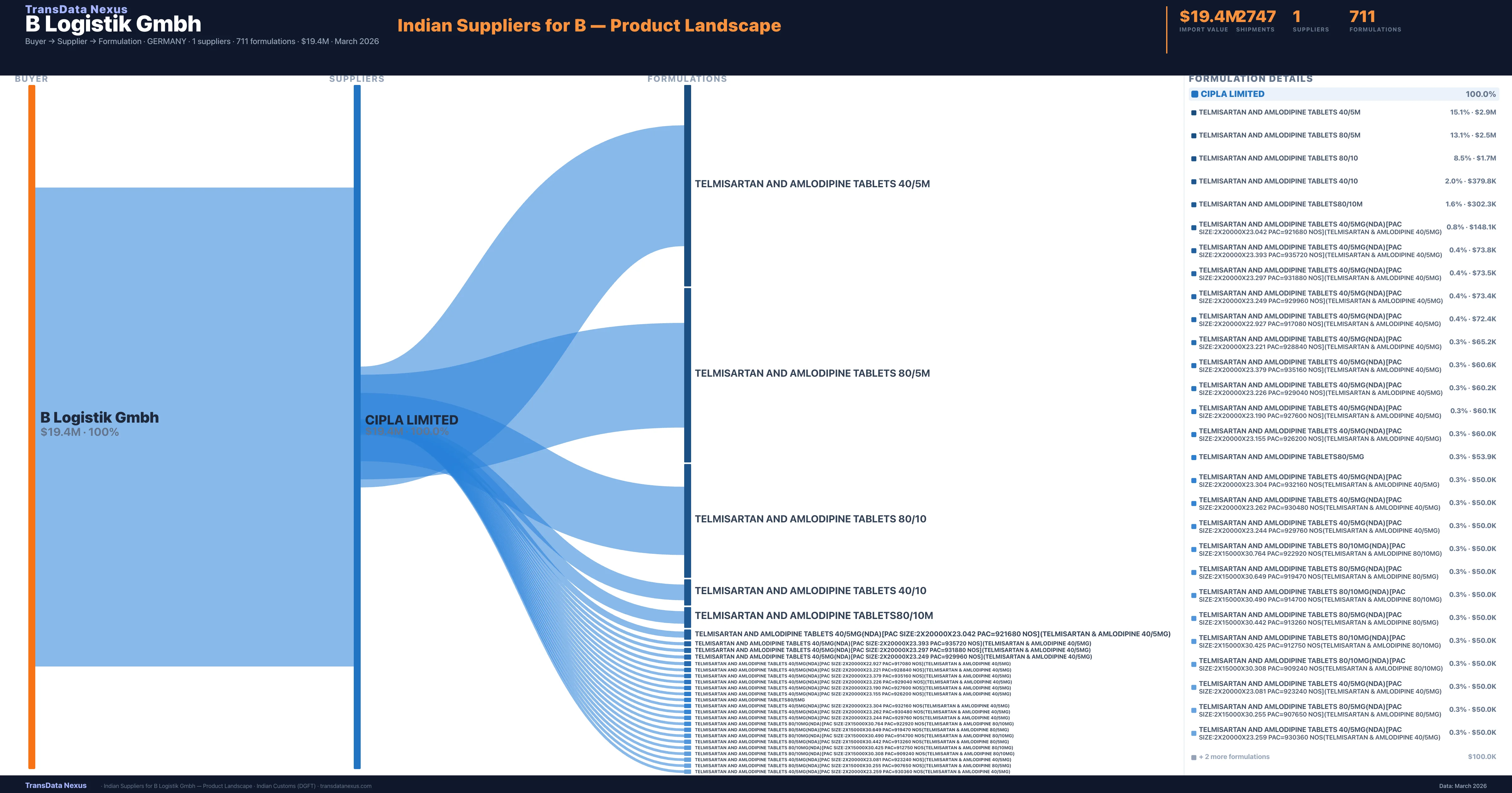 B Logistik Gmbh sources from 1 verified Indian supplier across 711 distinct formulations. The sourcing is highly concentrated — Cipla Limited accounts for 100.0% of total imports, indicating a strategic single-source relationship.