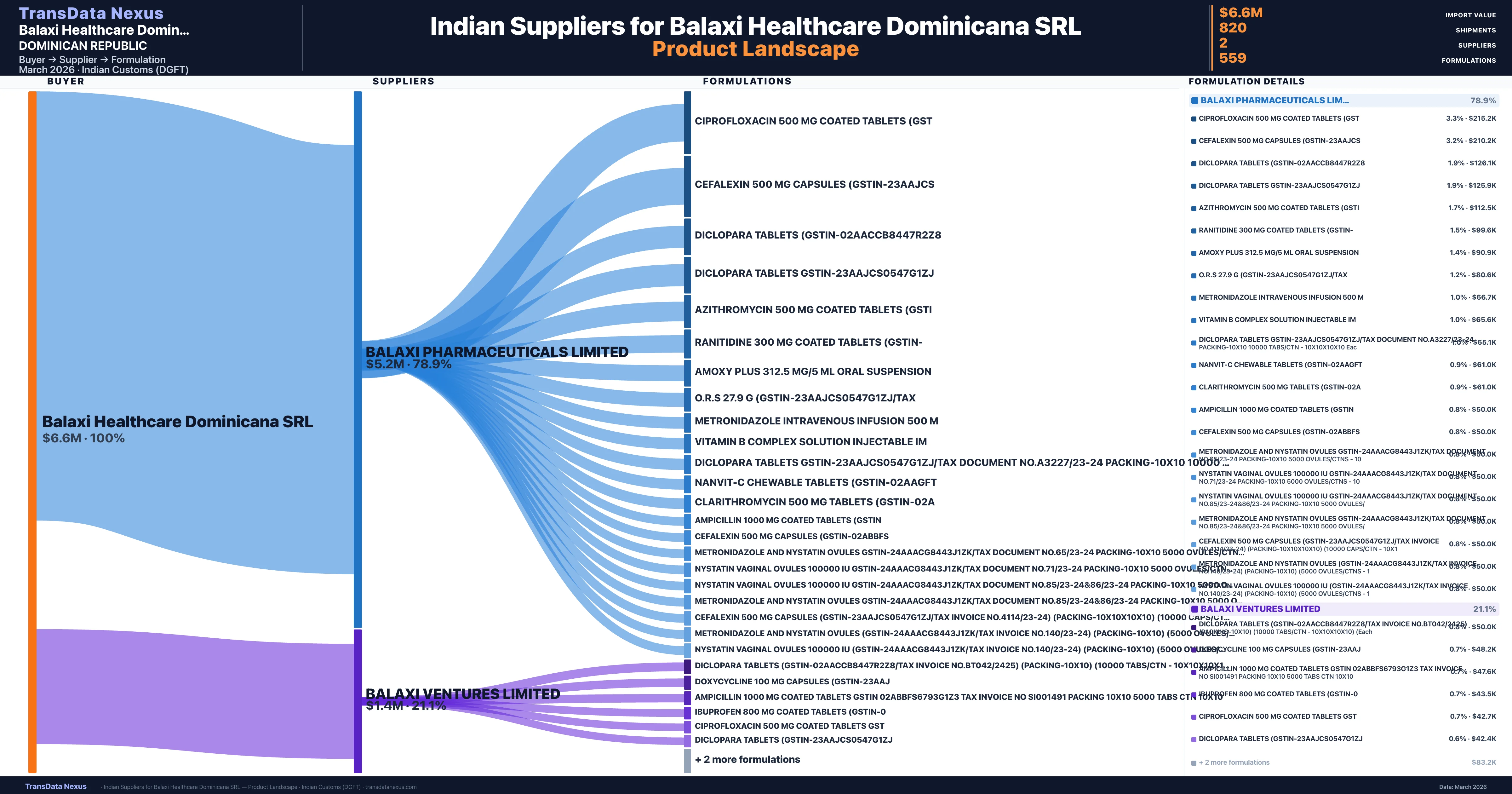 Balaxi Healthcare Dominicana SRL sources from 2 verified Indian suppliers across 559 distinct formulations. Total import value: $6.6M across 820 shipments.