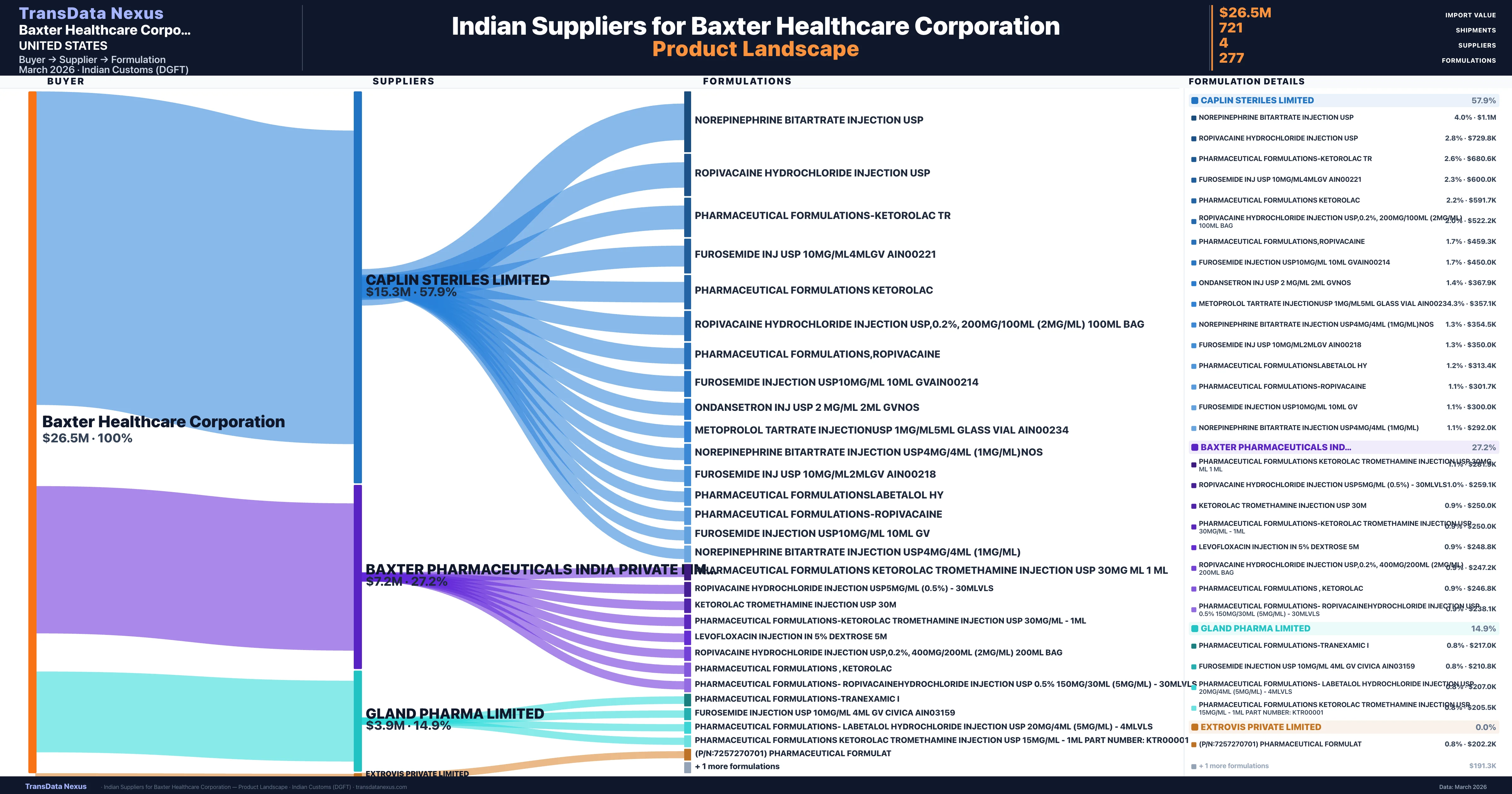 - 5.Supplier Verification: Baxter Healthcare Corporation sources from 4 verified Indian suppliers across 277 formulations, confirmed from customs records.