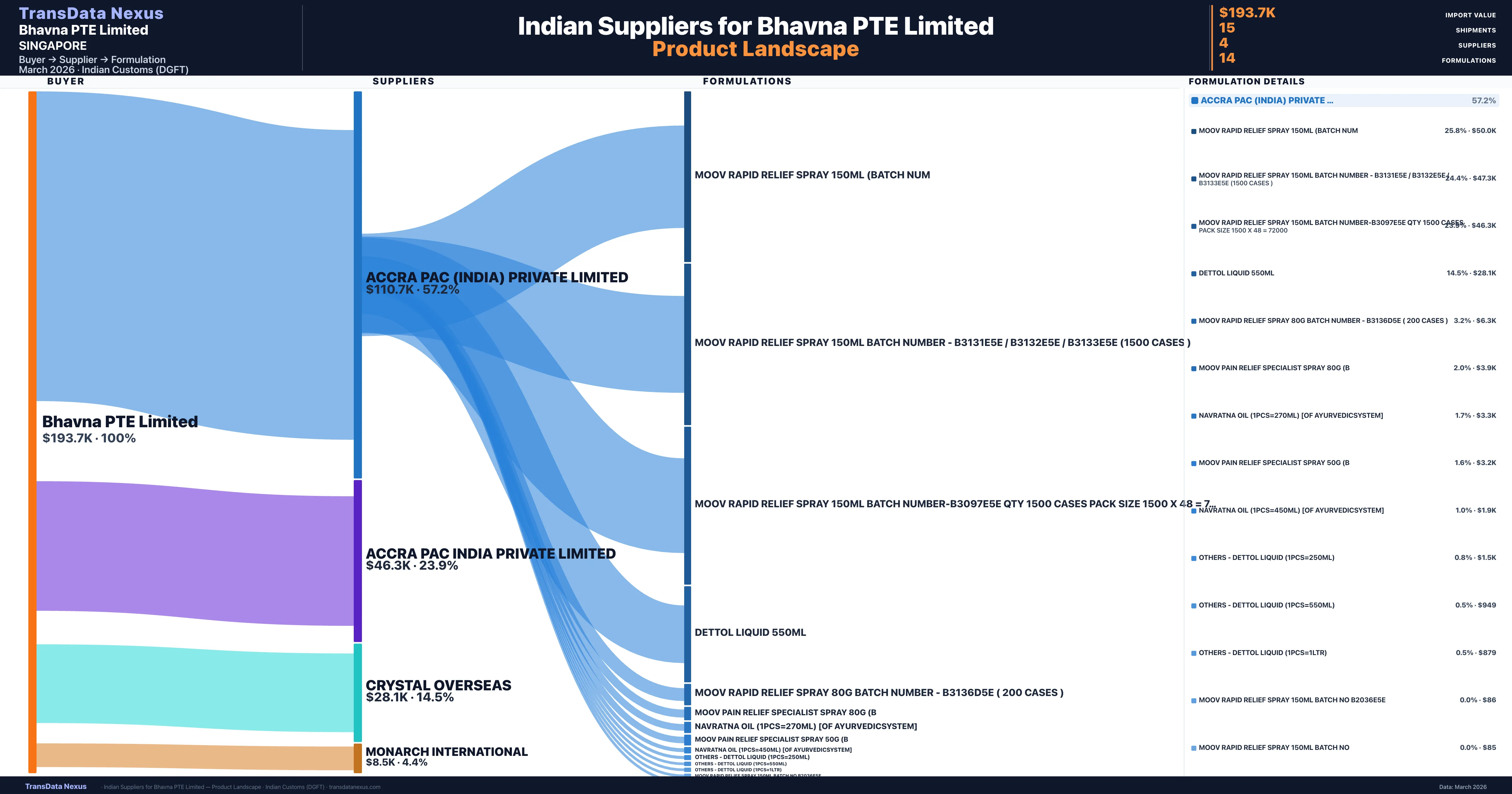 Bhavna PTE Limited is a pharmaceutical importer based in Singapore with a total trade value of $494.7K across 2 products in 1 therapeutic categories. Based on 24 verified import shipments from Indian Customs (DGFT) records, the company actively imports across multiple product segments. Bhavna PTE Limited sources from 4 verified Indian suppliers, with Accra Pac (india) Private Limited accounting for 57.2% of imports.