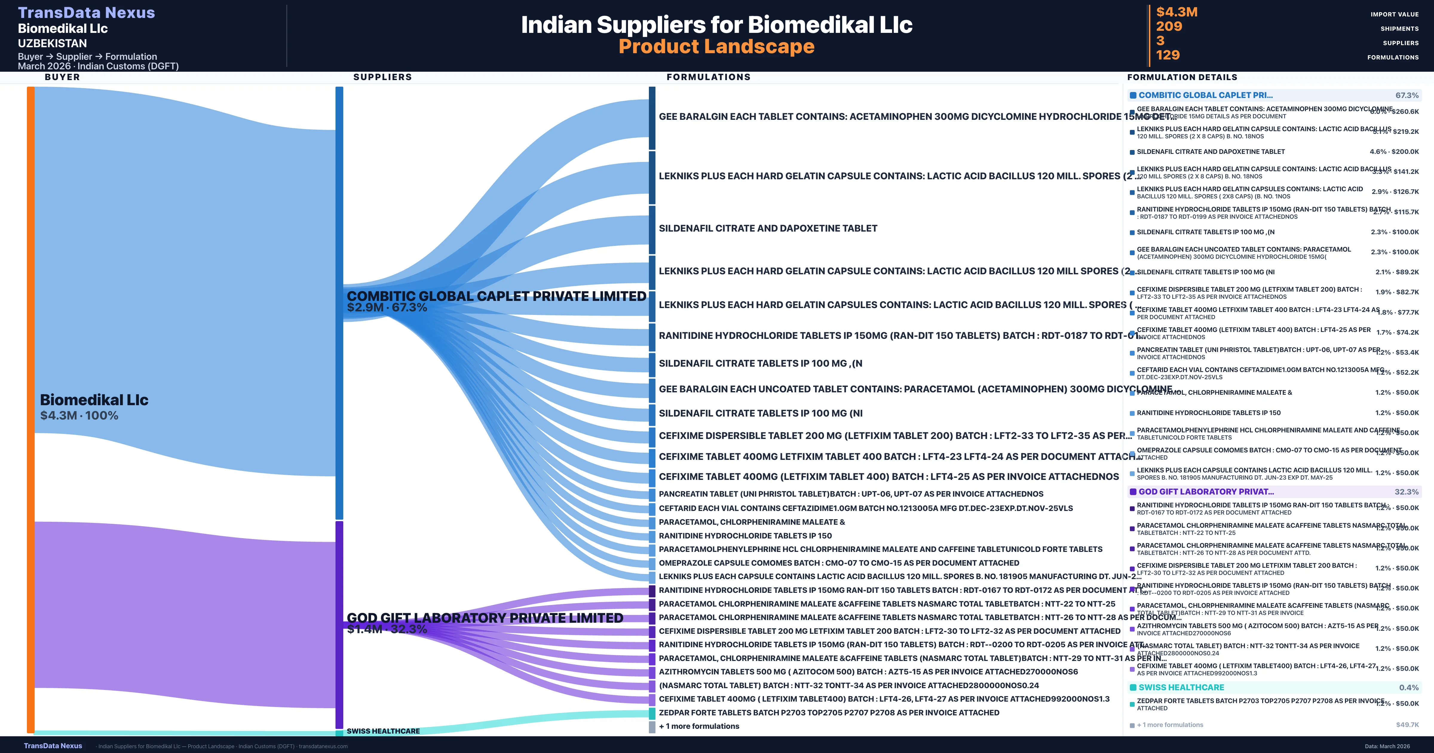 - 5.Supplier Verification: Biomedikal Llc sources from 3 verified Indian suppliers across 129 formulations, confirmed from customs records.