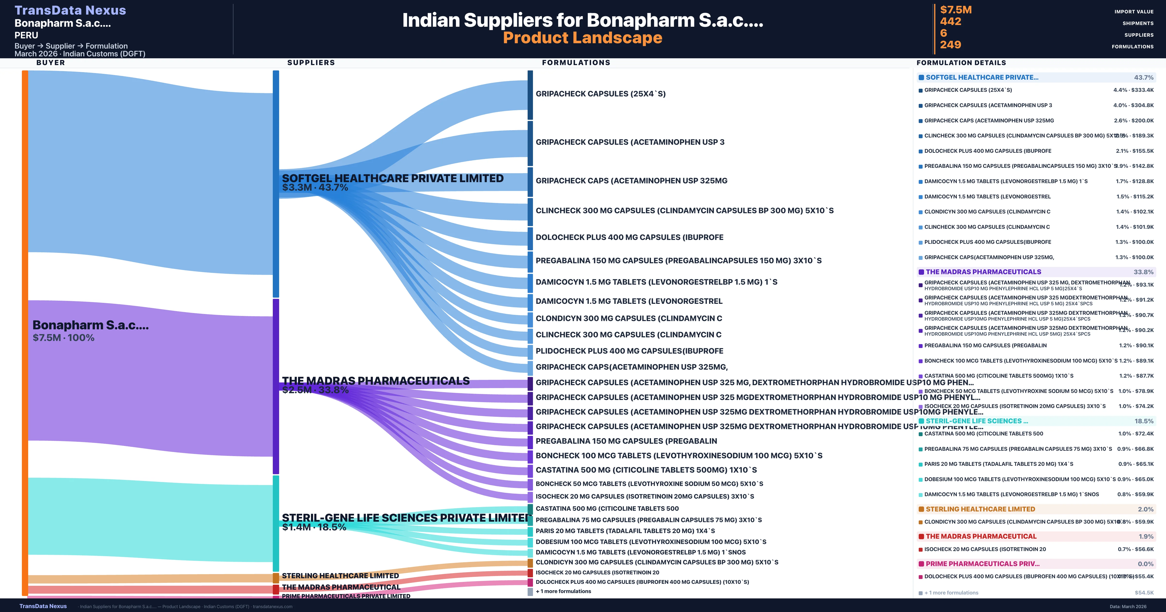- 5.Supplier Verification: Bonapharm S.a.c.... sources from 6 verified Indian suppliers across 249 formulations, confirmed from customs records.