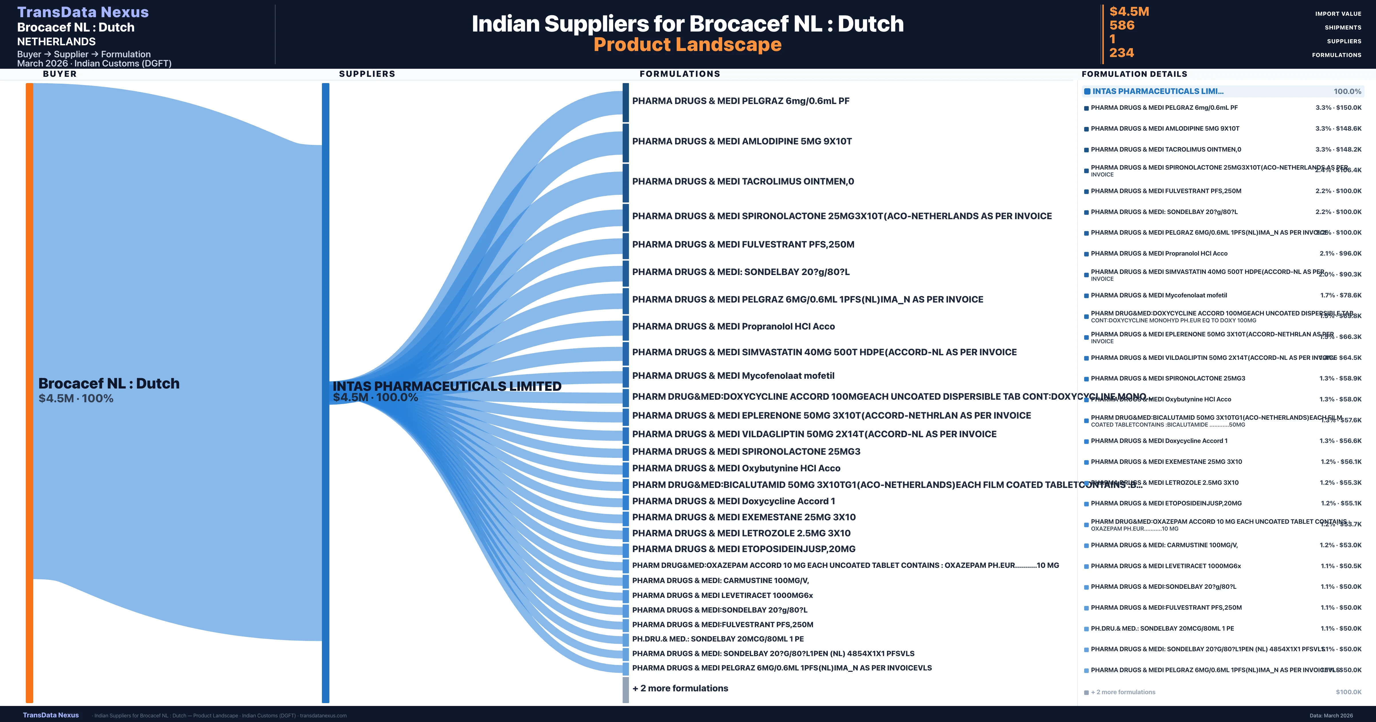 Brocacef NL : Dutch sources from 1 verified Indian supplier across 234 distinct formulations. The sourcing is highly concentrated — Intas Pharmaceuticals Limited accounts for 100.0% of total imports, indicating a strategic single-source relationship.