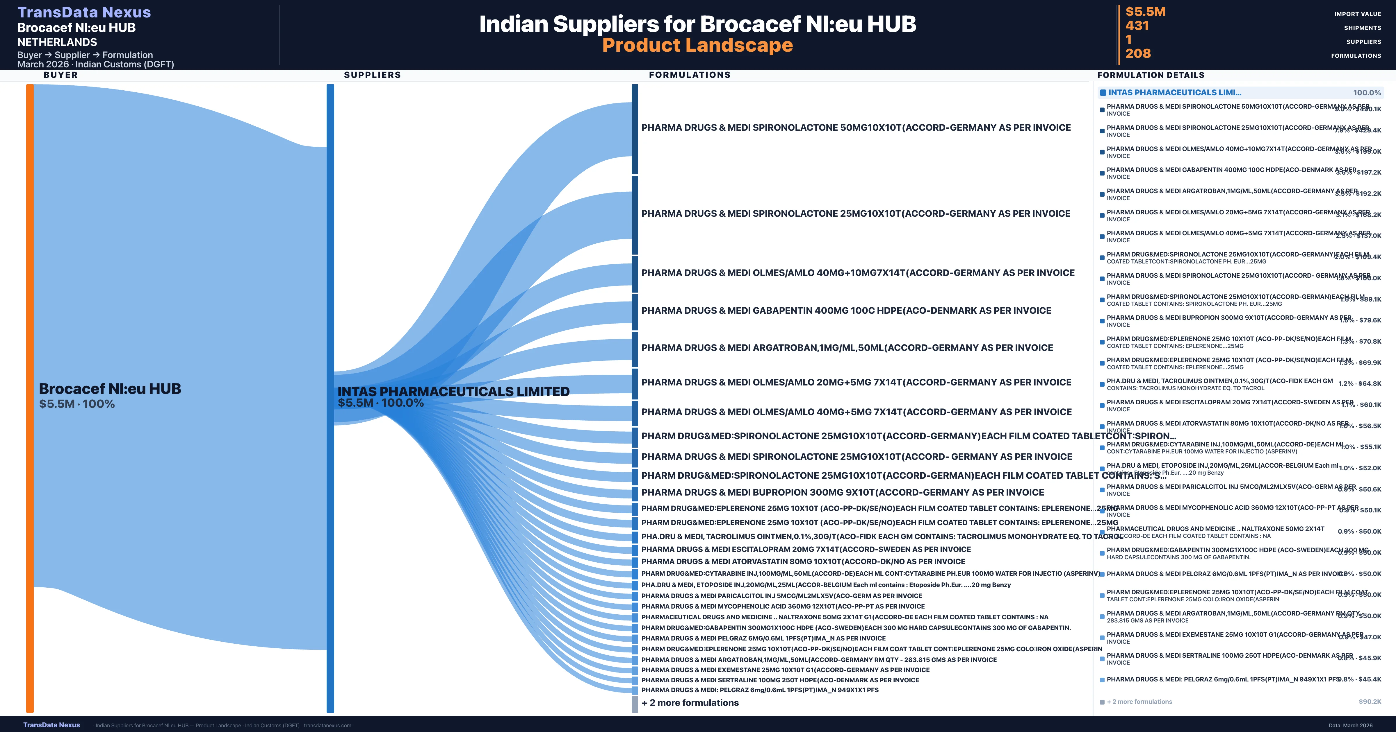 Brocacef Nl:eu HUB sources from 1 verified Indian supplier across 208 distinct formulations. The sourcing is highly concentrated — Intas Pharmaceuticals Limited accounts for 100.0% of total imports, indicating a strategic single-source relationship.