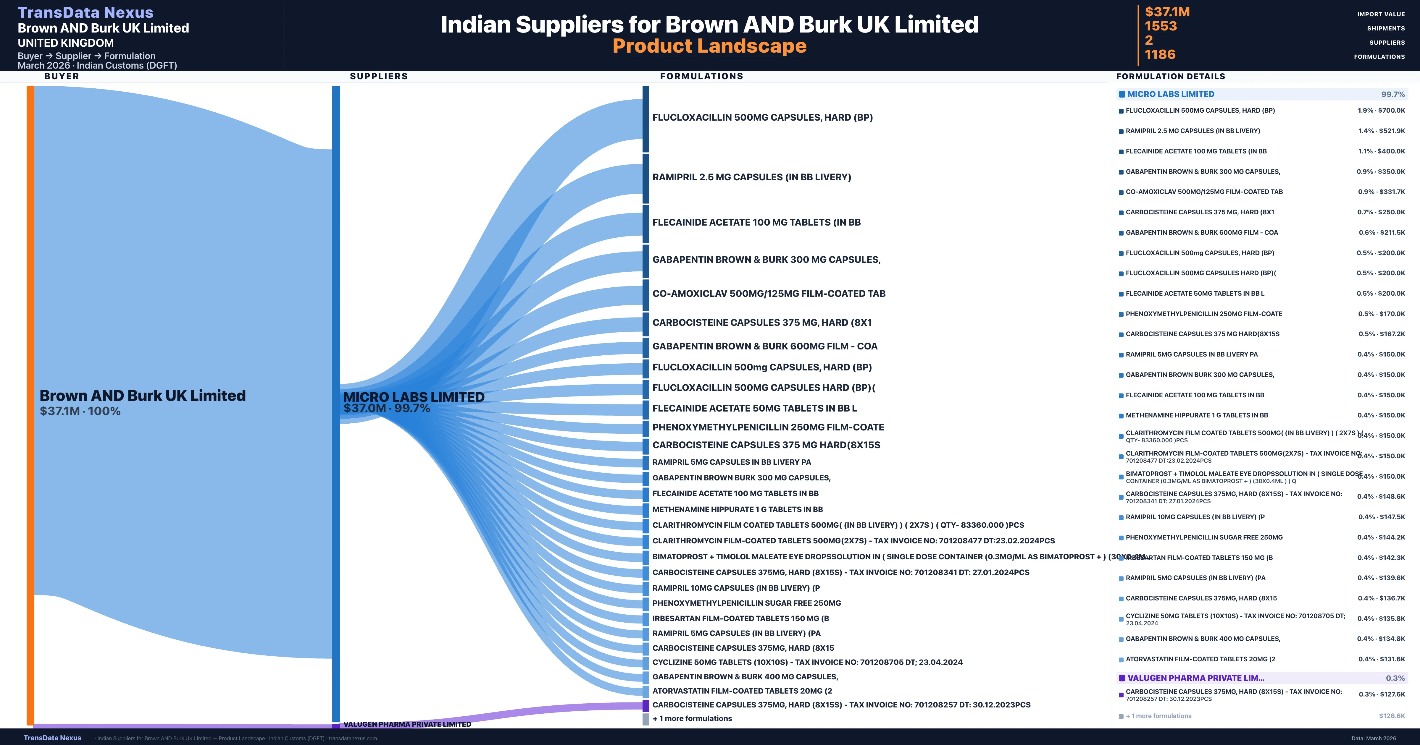 Brown AND Burk UK Limited sources from 2 verified Indian suppliers across 1,186 distinct formulations. The sourcing is highly concentrated — Micro Labs Limited accounts for 99.7% of total imports, indicating a strategic single-source relationship.