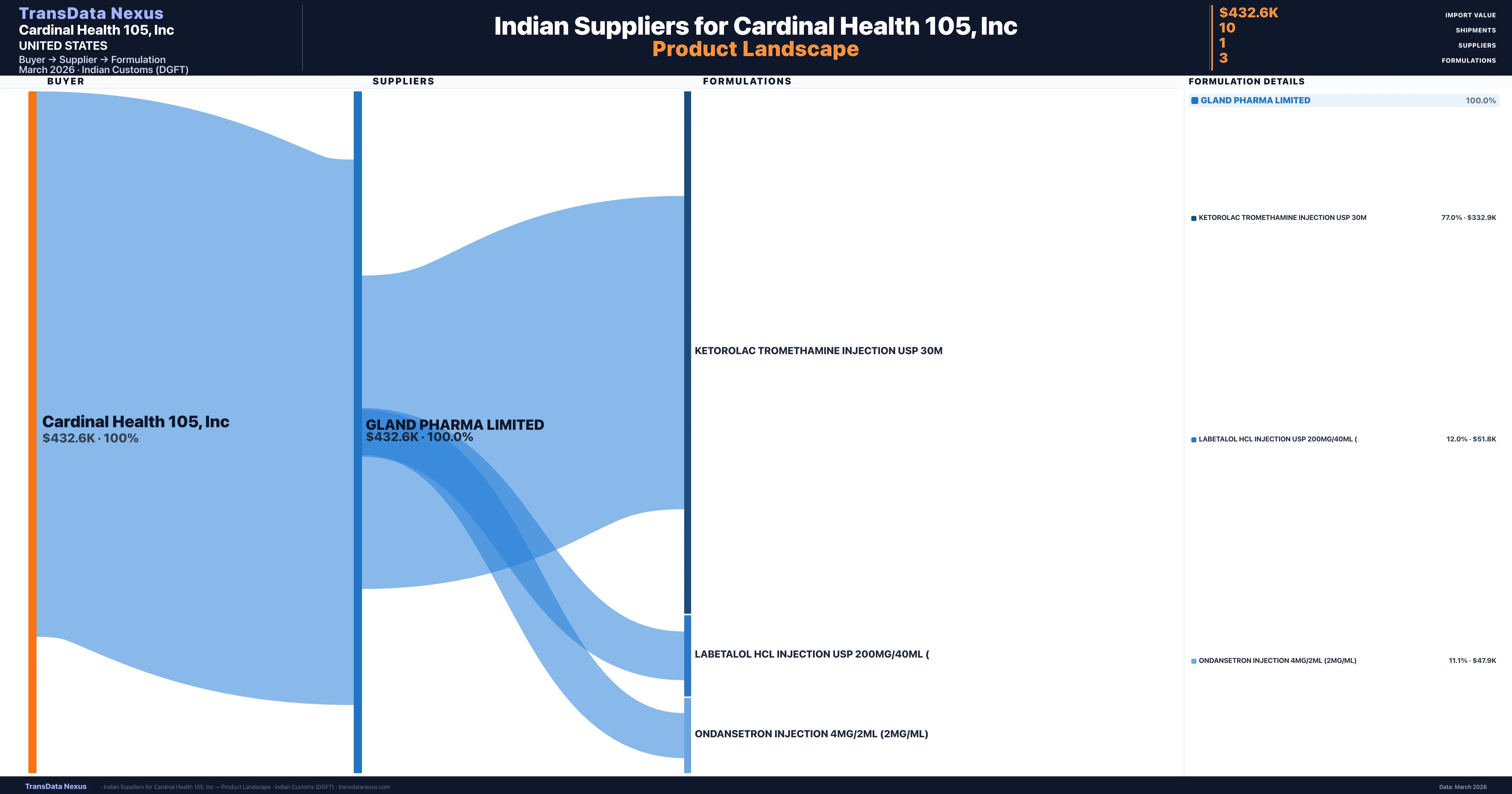 Cardinal Health 105, Inc sources from 1 verified Indian supplier across 3 distinct formulations. The sourcing is highly concentrated β Gland Pharma Limited accounts for 100.0% of total imports, indicating a strategic single-source relationship.