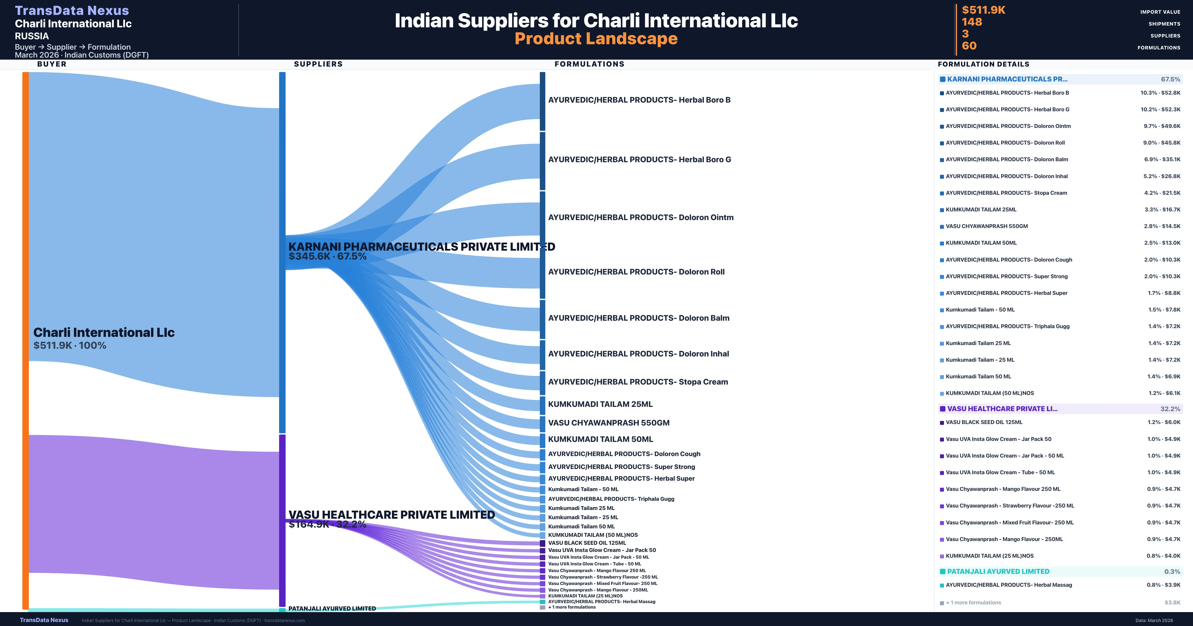 Charli International LLC's sourcing strategy exhibits a high degree of concentration, with 67.5% of its imports valued at $346K USD sourced from Karnani Pharmaceuticals Private Limited, and 32.2% valued at $165K USD from Vasu Healthcare Private Limited. This concentrated sourcing approach may present risks related to supply chain disruptions, such as potential delays or quality issues from a single supplier. However, the company's diversified product portfolio, encompassing 60 unique formulations, suggests a strategic choice to mitigate risks by offering a broad range of products to the Russian market.