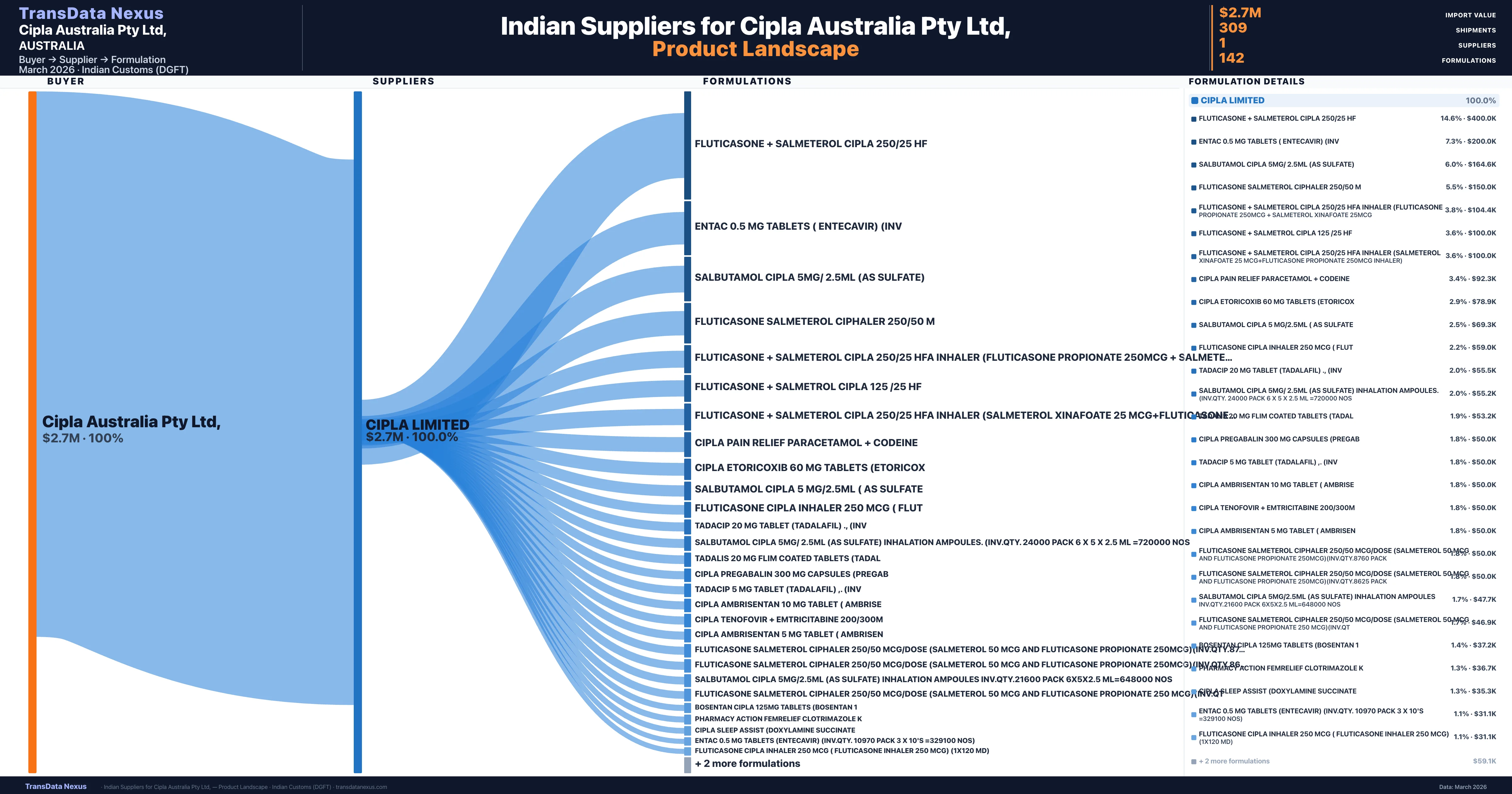 Cipla Australia Pty Ltd, sources from 1 verified Indian suppliers. The primary supplier is Cipla Limited (100.0% of imports, $2.7M).