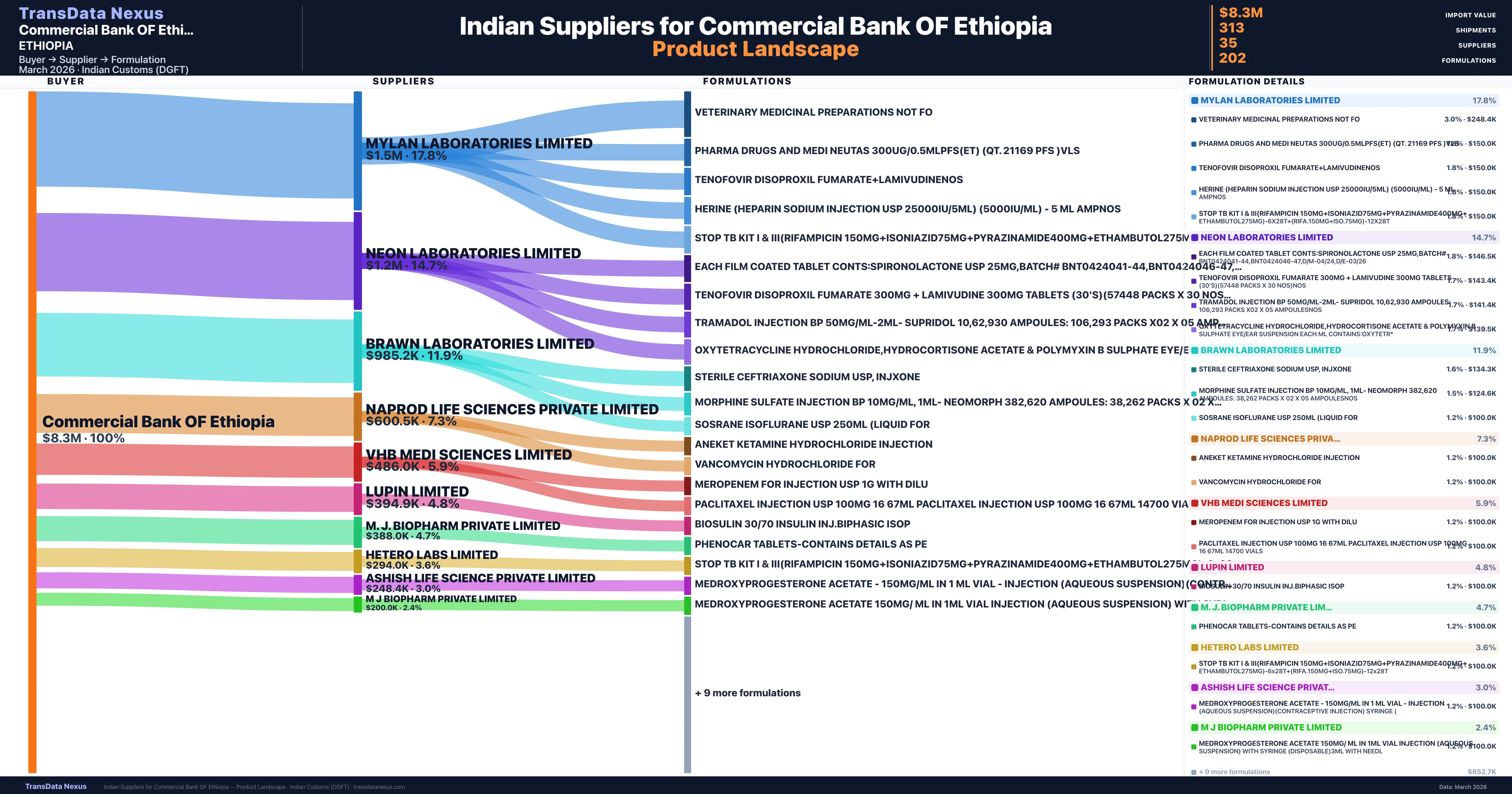Commercial Bank OF Ethiopia sources from 35 verified Indian suppliers. The primary supplier is Mylan Laboratories Limited (17.8% of imports, $1.5M).