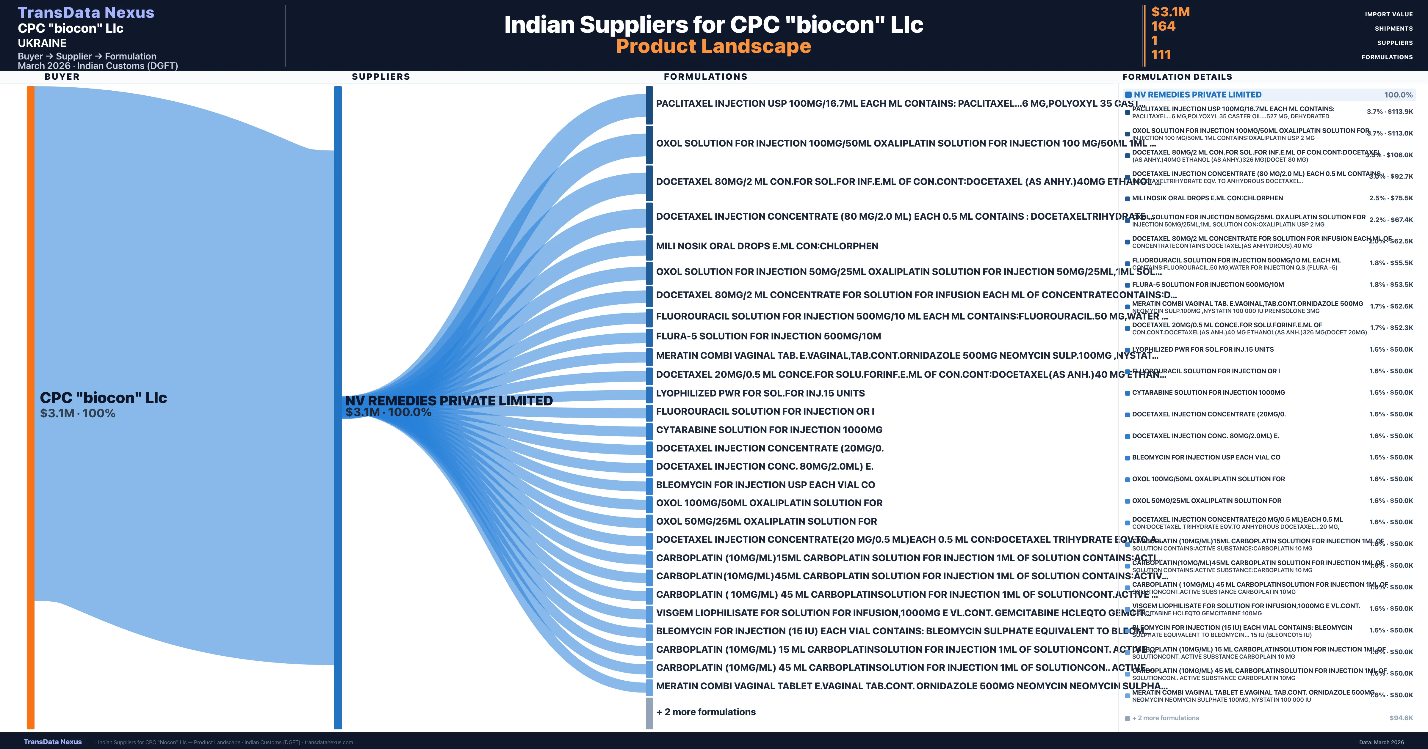 CPC "biocon" Llc sources from 1 verified Indian supplier across 111 distinct formulations. The sourcing is highly concentrated — Nv Remedies Private Limited accounts for 100.0% of total imports, indicating a strategic single-source relationship.