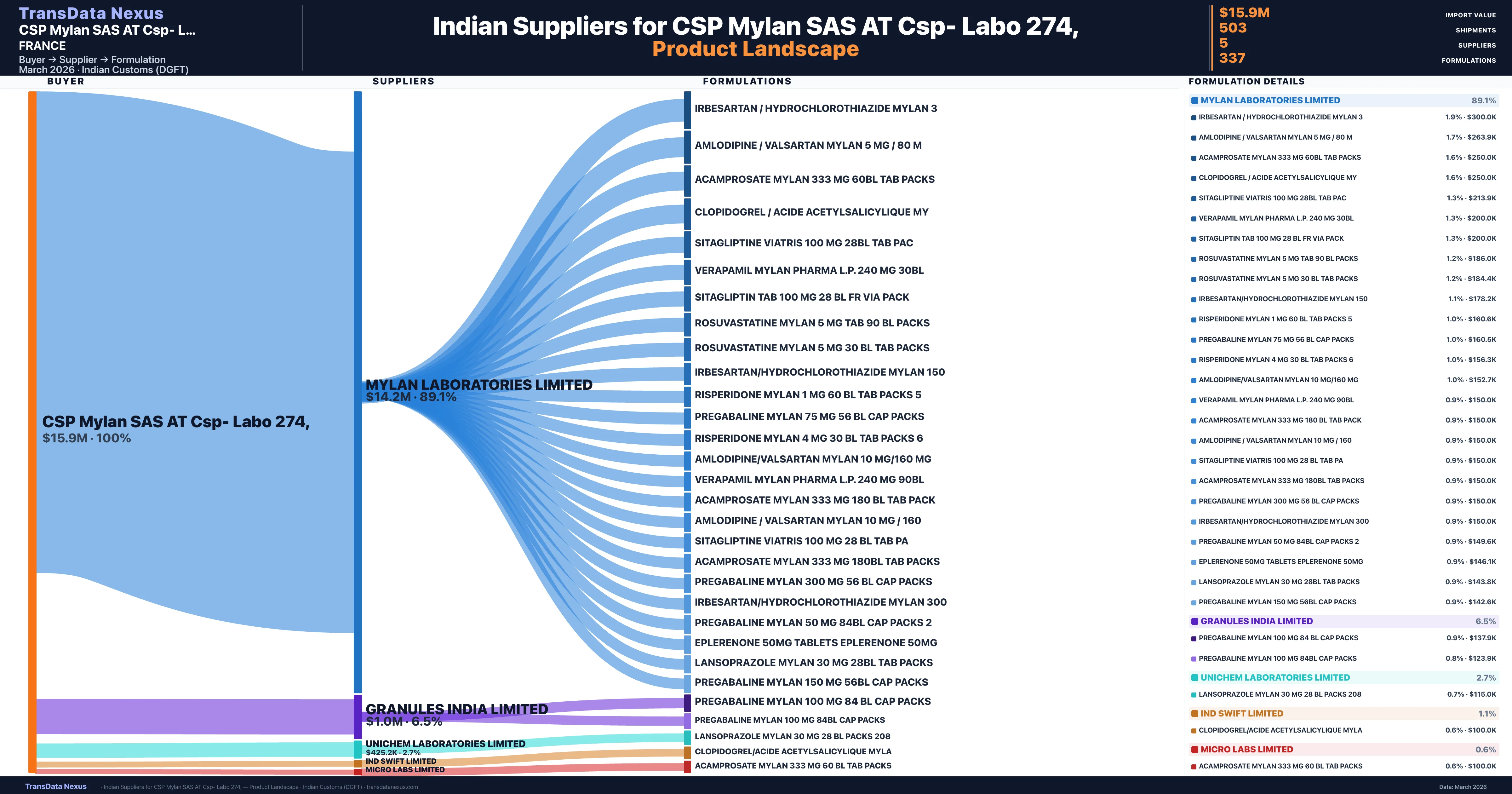 - 5.Supplier Verification: CSP Mylan SAS AT Csp- Labo 274, sources from 5 verified Indian suppliers across 337 formulations, confirmed from customs records.