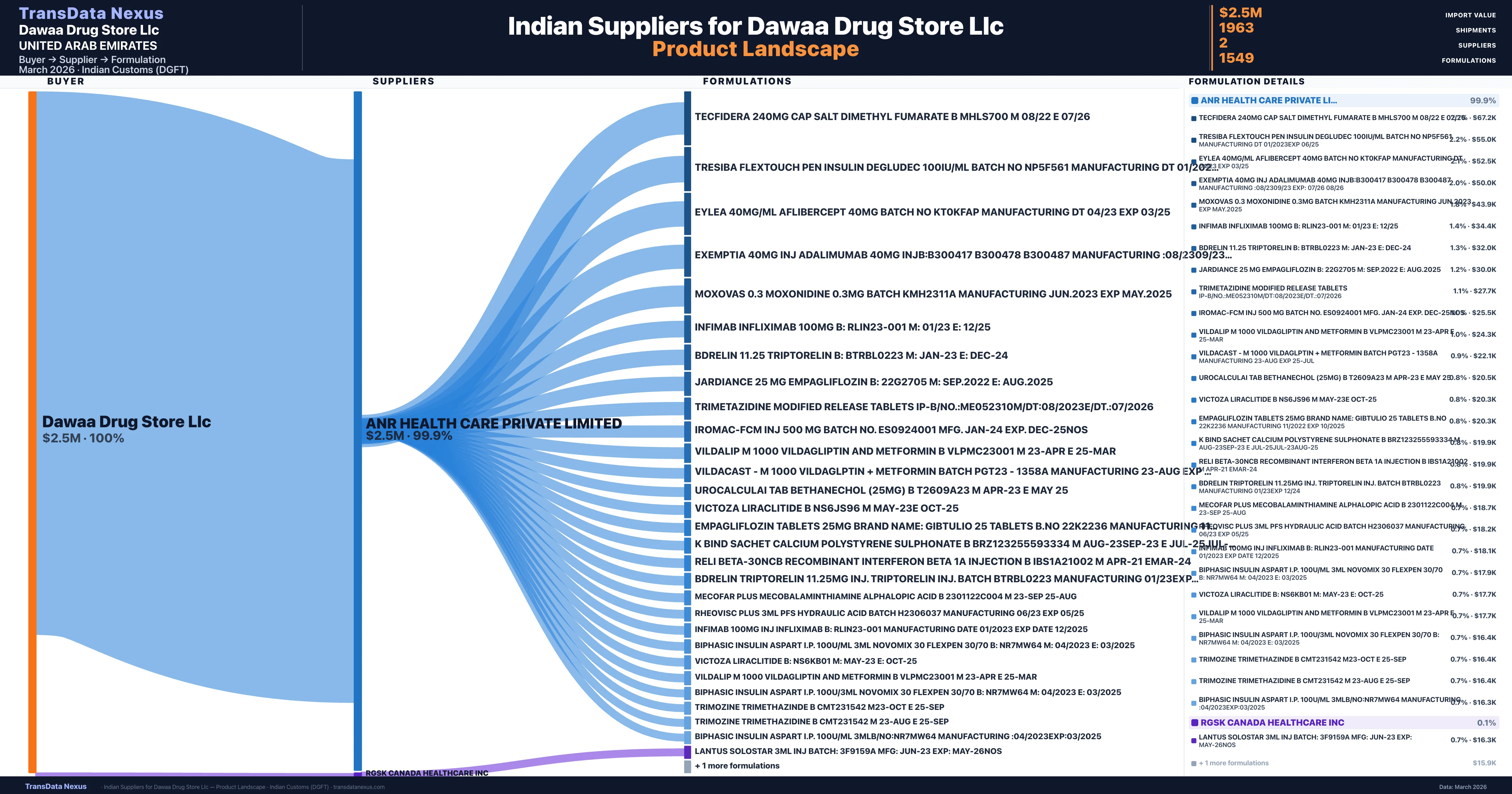 Dawaa Drug Store Llc sources from 2 verified Indian suppliers across 1,549 distinct formulations. The sourcing is highly concentrated β Anr Health Care Private Limited accounts for 99.9% of total imports, indicating a strategic single-source relationship.