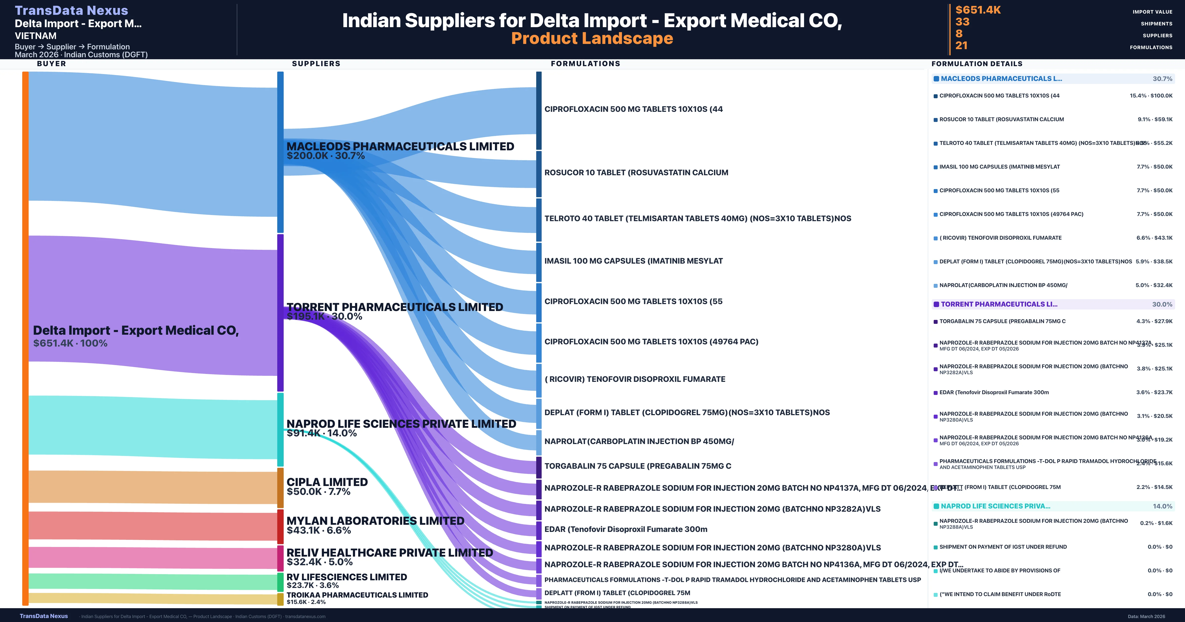 Delta Import - Export Medical CO, is a pharmaceutical importer based in Vietnam with a total trade value of $400.0K across 2 products in 2 therapeutic categories. Based on 8 verified import shipments from Indian Customs (DGFT) records, the company actively imports across multiple product segments. Delta Import - Export Medical CO, sources from 8 verified Indian suppliers, with Macleods Pharmaceuticals Limited accounting for 30.7% of imports.