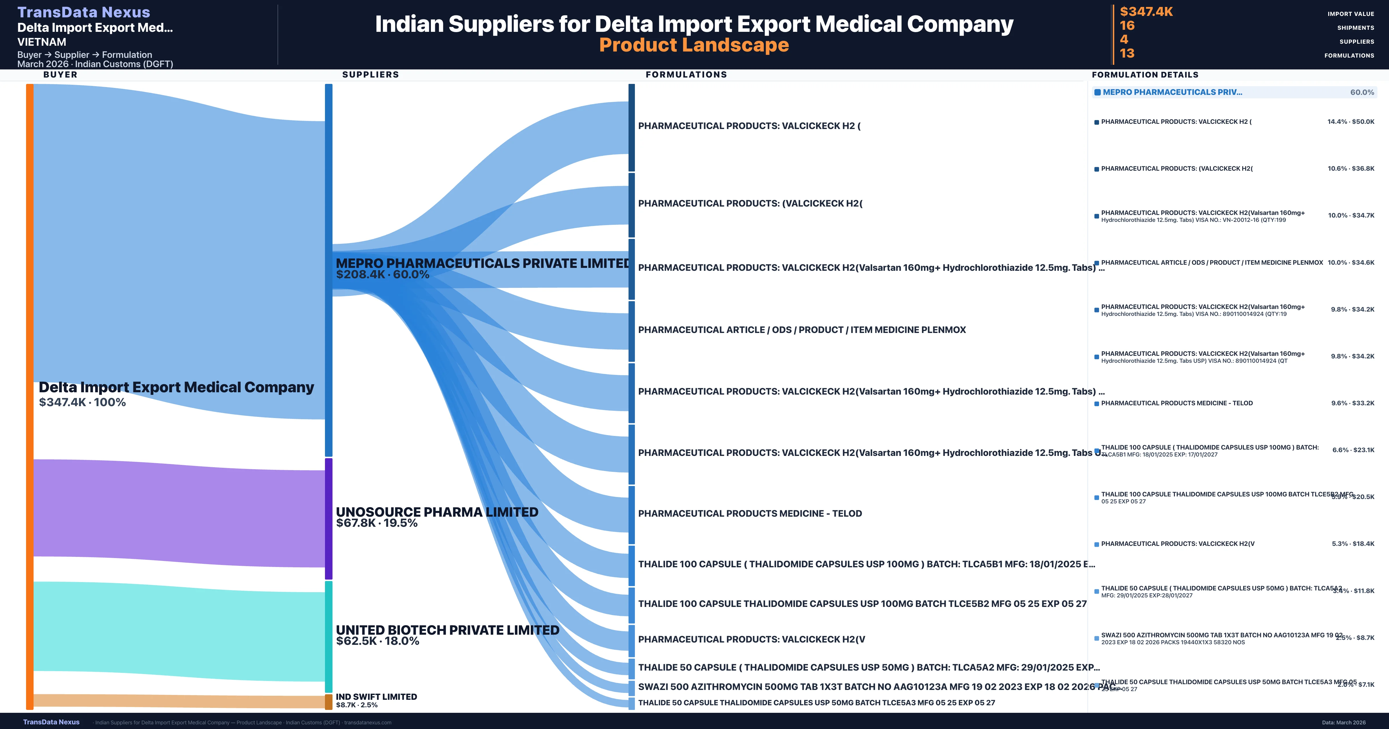 Delta Import Export Medical Company is a pharmaceutical importer based in Vietnam with a total trade value of $362.5K across 3 products in 2 therapeutic categories. Based on 10 verified import shipments from Indian Customs (DGFT) records, the company actively imports across multiple product segments. Delta Import Export Medical Company sources from 4 verified Indian suppliers, with Mepro Pharmaceuticals Private Limited accounting for 60.0% of imports.