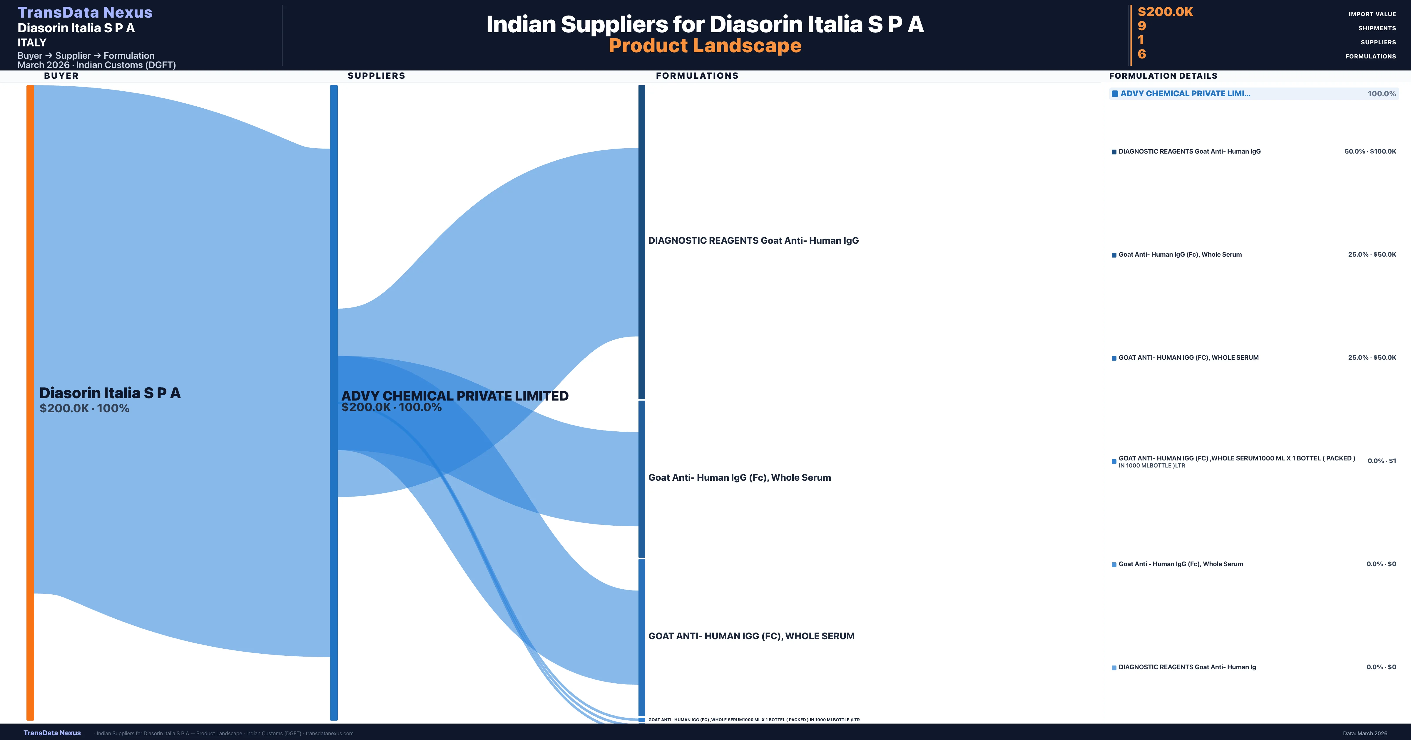 Diasorin Italia S P A sources from 1 verified Indian supplier across 6 distinct formulations. The sourcing is highly concentrated β Advy Chemical Private Limited accounts for 100.0% of total imports, indicating a strategic single-source relationship.
