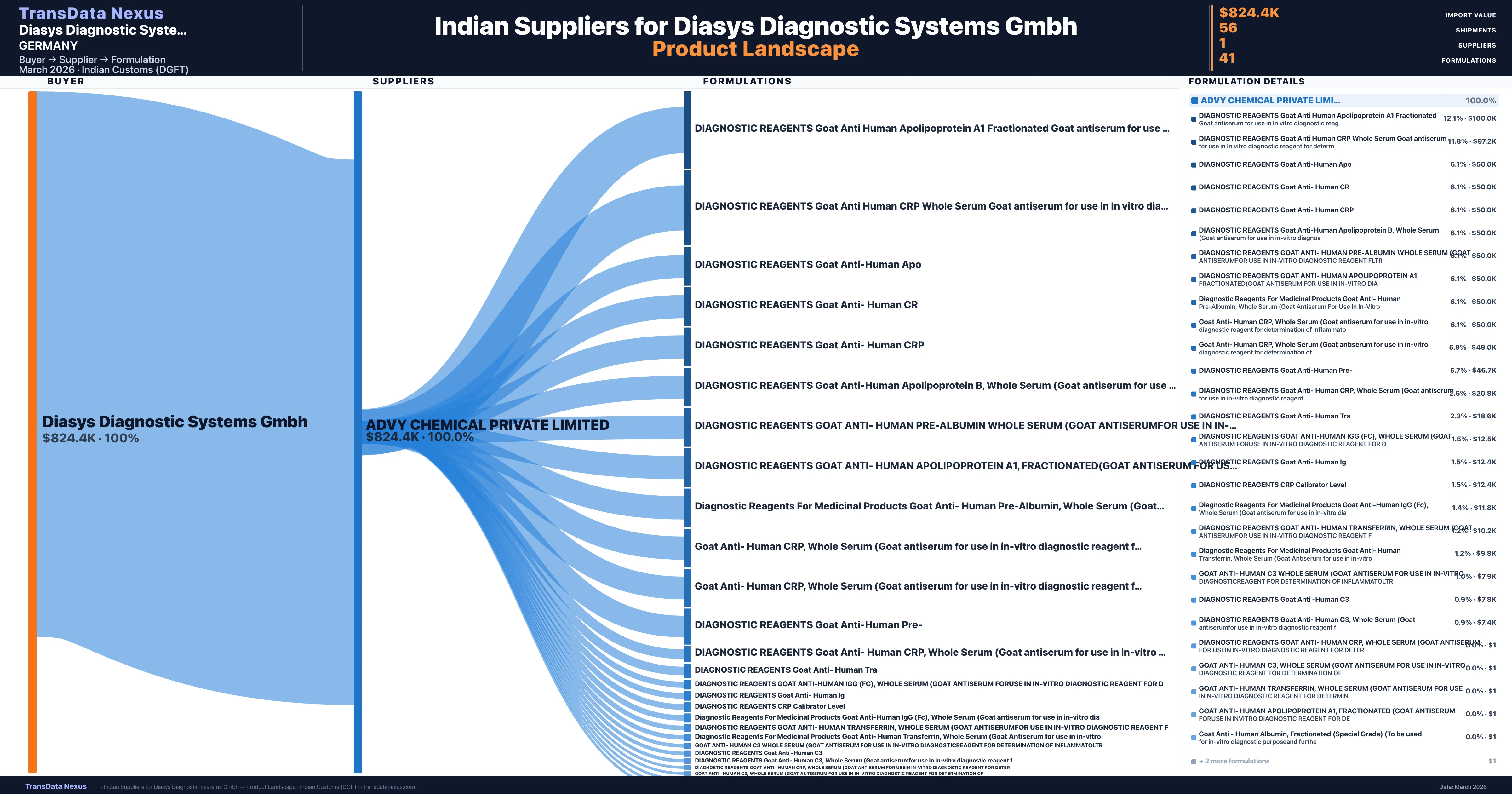 Diasys Diagnostic Systems Gmbh sources from 1 verified Indian supplier across 41 distinct formulations. The sourcing is highly concentrated — Advy Chemical Private Limited accounts for 100.0% of total imports, indicating a strategic single-source relationship.
