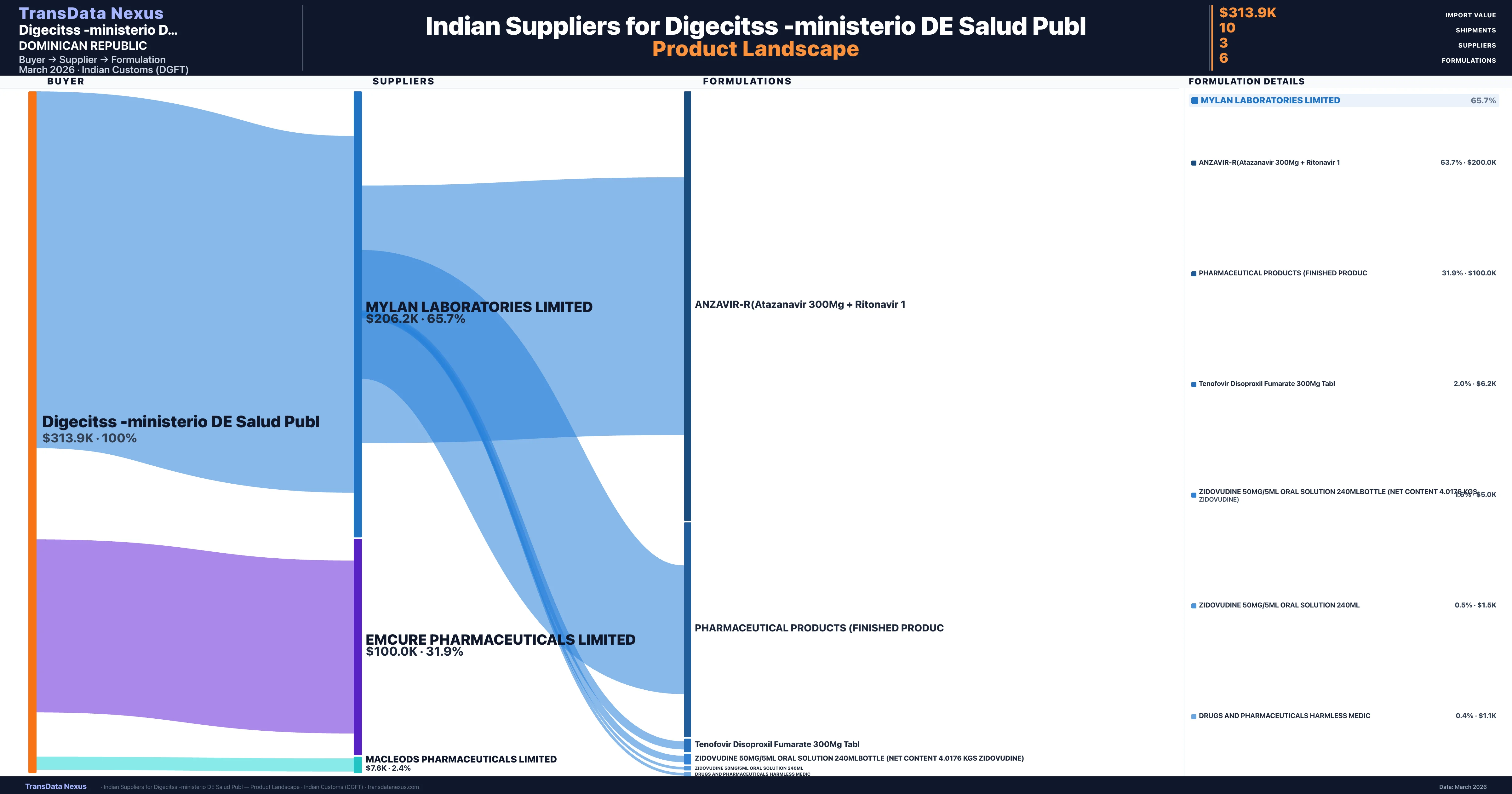 Digecitss -ministerio DE Salud Publ sources from 3 verified Indian suppliers. The primary supplier is Mylan Laboratories Limited (65.7% of imports, $206.2K).