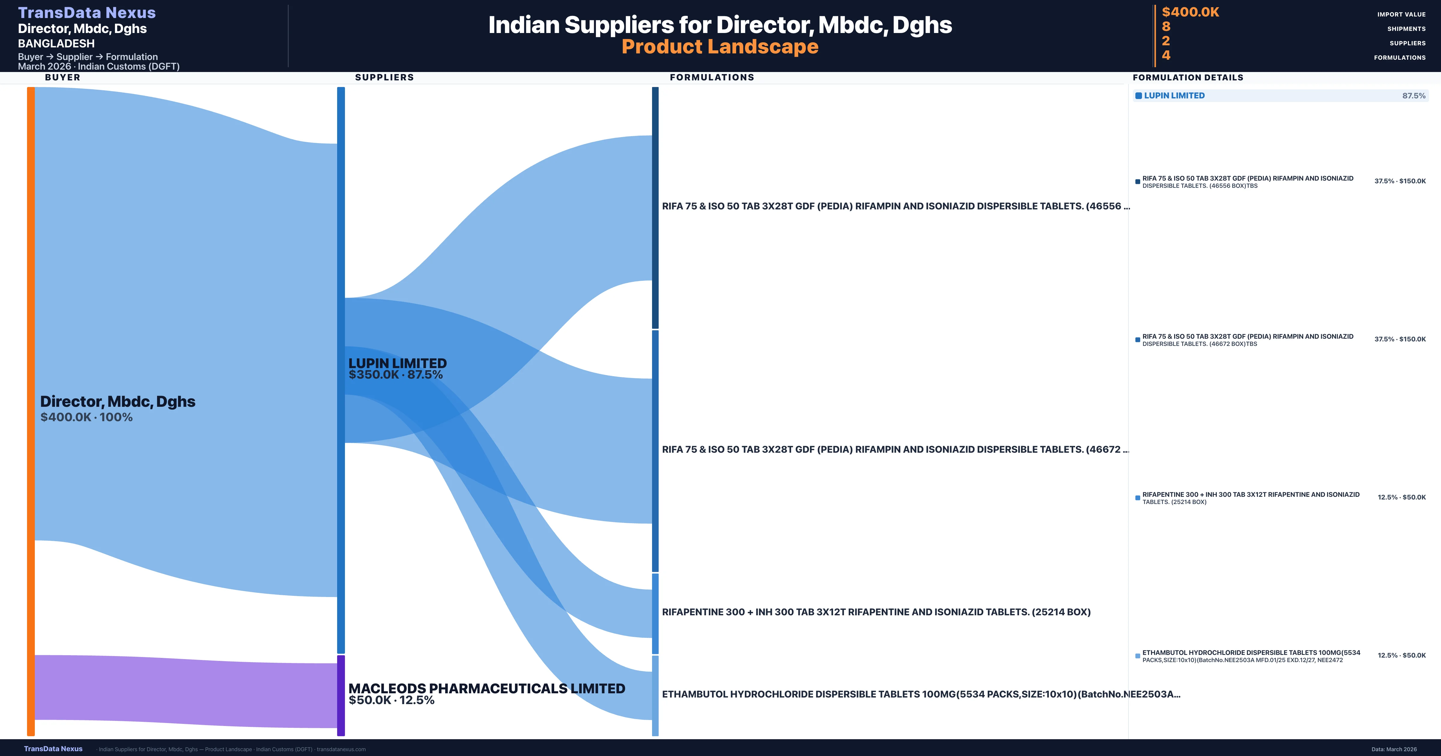 Director, Mbdc, Dghs sources from 2 verified Indian suppliers across 4 distinct formulations. The sourcing is highly concentrated — Lupin Limited accounts for 87.5% of total imports, indicating a strategic single-source relationship.