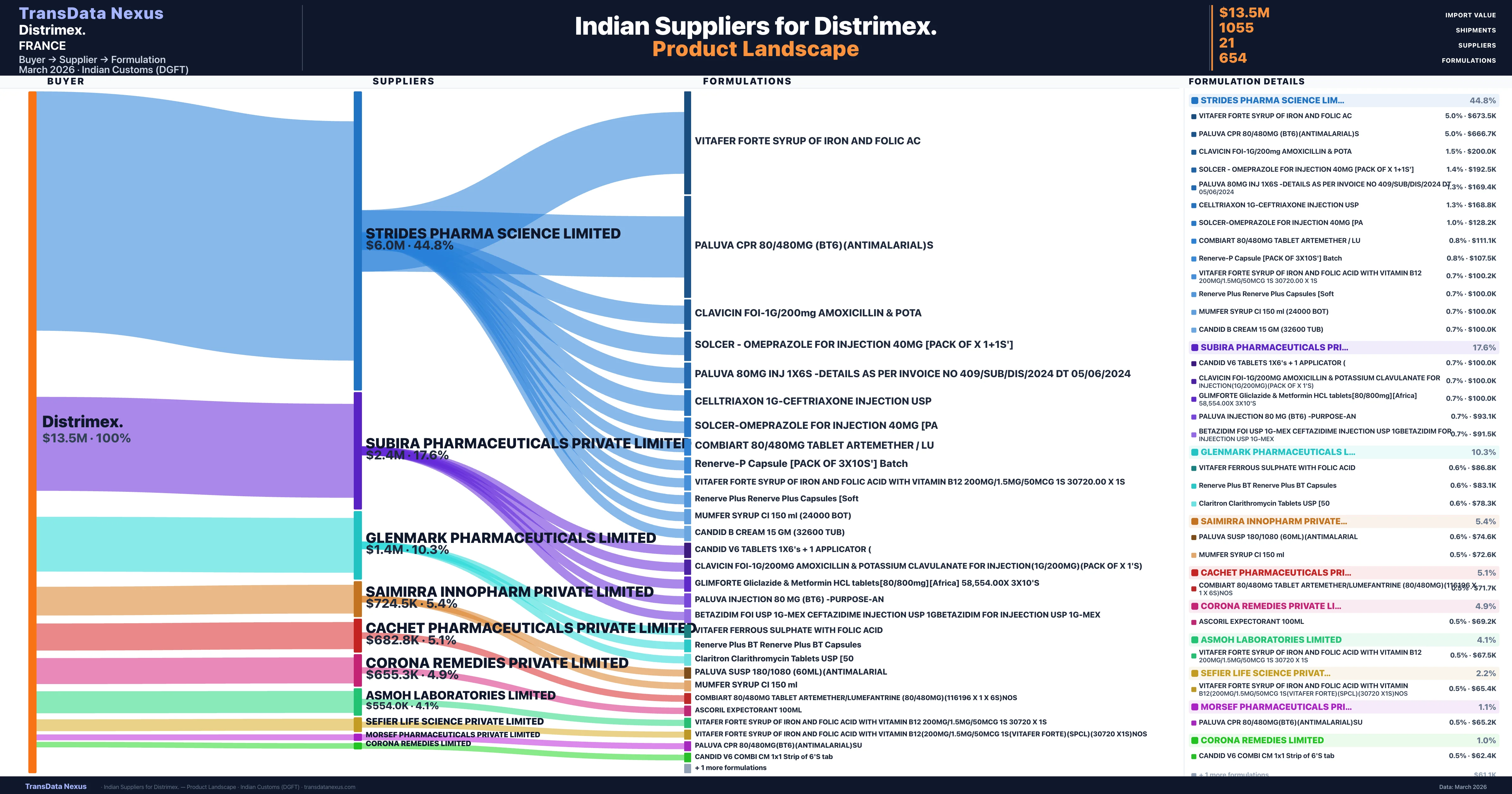 Distrimex. is a pharmaceutical importer based in France with a total trade value of $3.8M across 4 products in 2 therapeutic categories. Based on 111 verified import shipments from Indian Customs (DGFT) records, the company actively imports across multiple product segments. Distrimex. sources from 21 verified Indian suppliers, with Strides Pharma Science Limited accounting for 44.8% of imports.