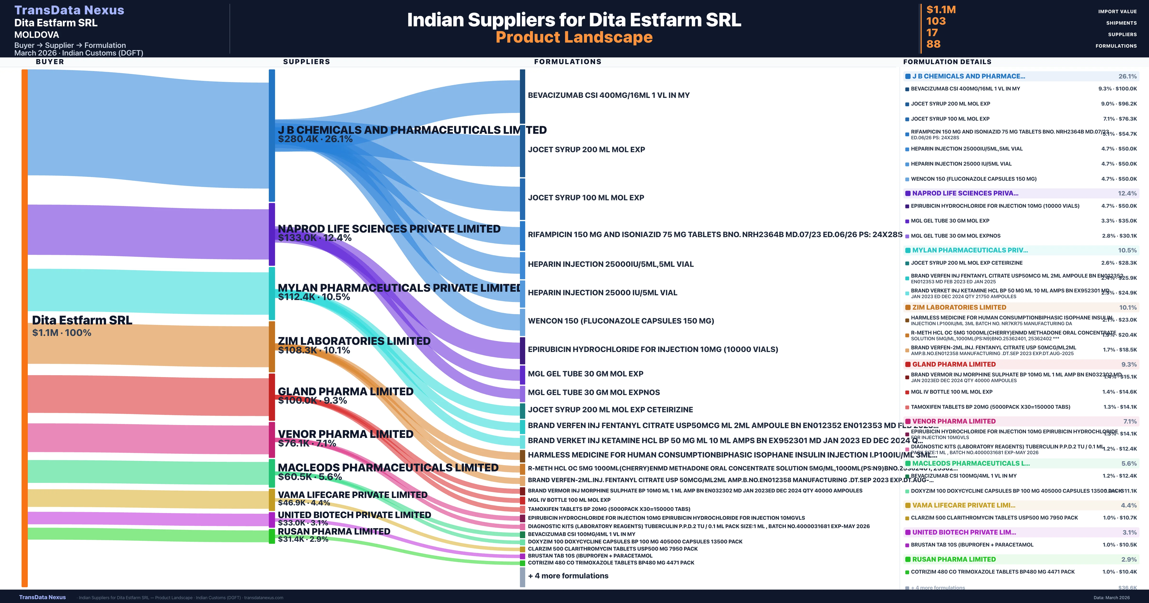 Dita Estfarm SRL is a pharmaceutical importer based in Moldova with a total trade value of $277.1K across 2 products in 1 therapeutic categories. Based on 6 verified import shipments from Indian Customs (DGFT) records, the company actively imports across multiple product segments. Dita Estfarm SRL sources from 17 verified Indian suppliers, with J B Chemicals And Pharmaceuticals Limited accounting for 26.1% of imports.