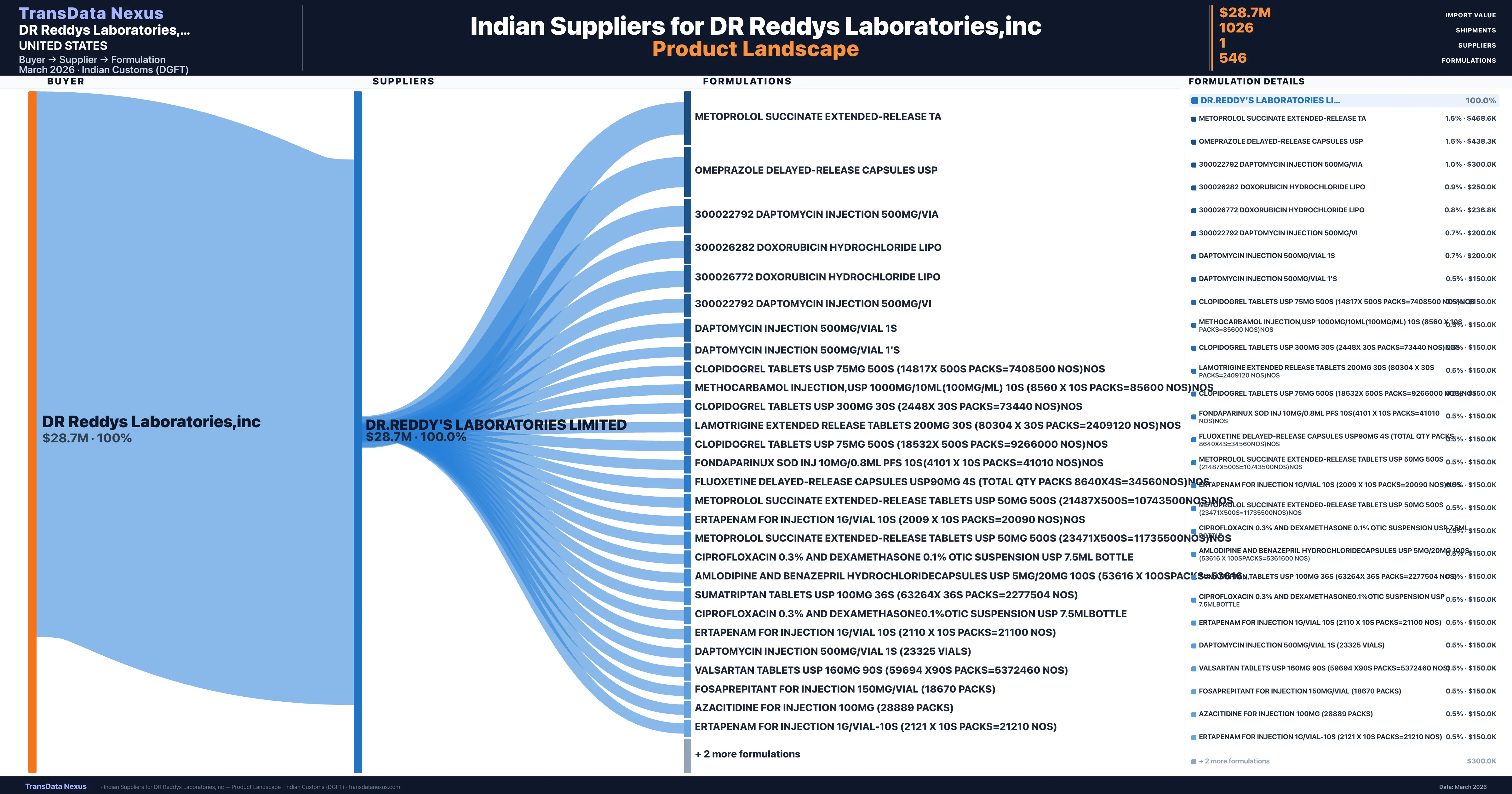 DR Reddys Laboratories,inc sources from 1 verified Indian supplier across 546 distinct formulations. The sourcing is highly concentrated β Dr.reddy's Laboratories Limited accounts for 100.0% of total imports, indicating a strategic single-source relationship.