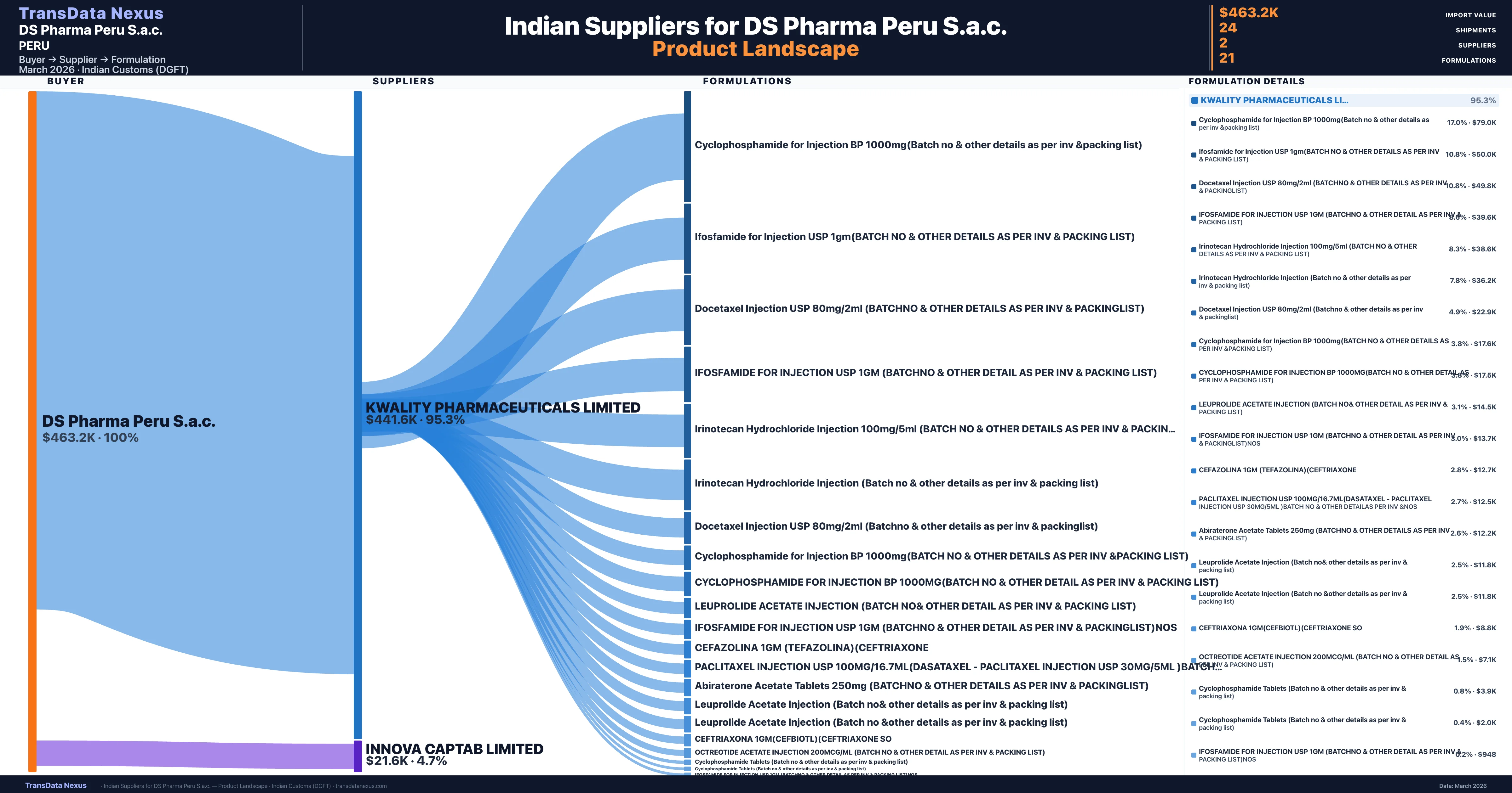 DS Pharma Peru S.a.c. is a pharmaceutical importer based in Peru with a total trade value of $237.8K across 2 products in 2 therapeutic categories. Based on 10 verified import shipments from Indian Customs (DGFT) records, the company actively imports across multiple product segments. DS Pharma Peru S.a.c. sources from 2 verified Indian suppliers, with Kwality Pharmaceuticals Limited accounting for 95.3% of imports.